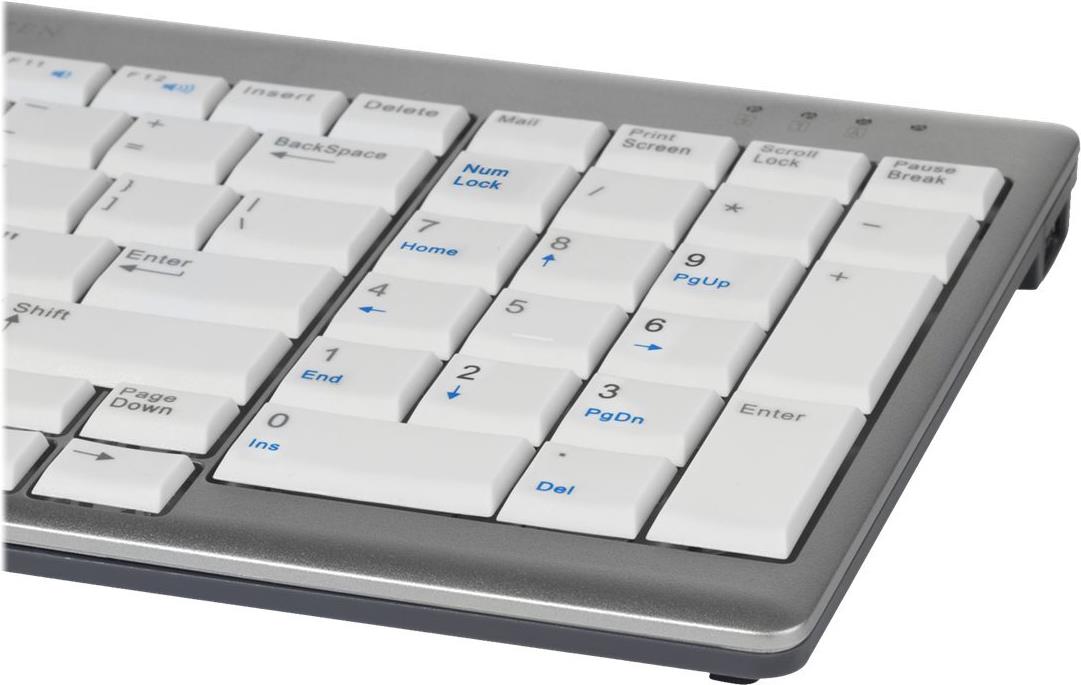 Das UltraBoard 960 Compact Standard ist eine Tastatur für all diejenigen, die es bevorzugen mit einem Ziffernblock zu arbeiten. Eine erstklassige Tastatur, die allen ergonomischen Anforderungen und den DIN EN ISO Normen gerecht wird, wie z.B. in Layout, Tastenform und -farbe. Gleichzeitig bietet sie großartige technische Features, wie zwei USB-Ports, Multimedia-Tasten, Hot-Keys und vieles mehr. Eine Tastatur, die 80 mm schmaler ist als eine herkömmliche Tastatur und eine komfortable und ergonomische Arbeitsweise garantiert.