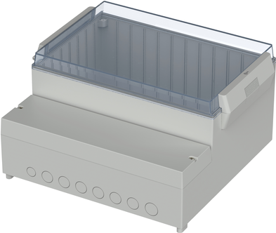 Das Gehäuse hat eingespritzte Nuten für den Karteneinschub senkrecht und waagerecht, Montagenocken und im Klemmraum Anschraubpunkte für Tragschienen. Aufhängung für ...