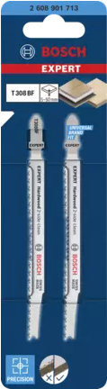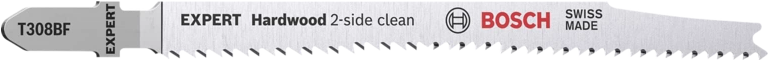 Bosch 2608901713 Stichsägeblatt EXPERT - Hohe Präzision für ausrissfreies Schneiden von laminierten Arbeitsplatten! Bi-Metall Blatt: Kombiniert harte Zähne mit flexiblem Blattkörper. Unter Tischlern und Schreinern war es schon immer eine Kunst sicherzustellen - dass der sichtbare Teil des Arbeitsmaterials die ¿saubere Seite¿ eines Stichsägenschnitts zeigt. Manchmal muss man das Werkstück zum Sägen umdrehen oder sägt von der Unterseite - um die gewünschte Schnittqualität auf der Sichtseite zu haben. Oder du verwendest das EXPERT `Hardwood 2-side clean¿ - welches dank seiner Zahngeometrie auf beiden Seiten einen perfekten - ausrissfreien Schnitt bietet. Hergestellt aus Bi-Metall ¿ einer Leiste aus Schnellarbeitsstahl - die auf ein flexibles Stahlblatt geschweisst wird - um Festigkeit und Flexibilität zu kombinieren ¿ ist das Bosch EXPERT 'Hardwood 2-side clean' Stichsägeblatt robust genug um beschichtete Küchenplatten aus Grobspanplatten oder Hartholz zu schneiden. Erhältlich für ausrissfreie gerade Schnitte (T308BF) und für besonders genaue ausrissfreie Winkelschnitte (T308BFP) Ausrissfreie Schnitte mit 2-side Clean Geometry. (2608901713)