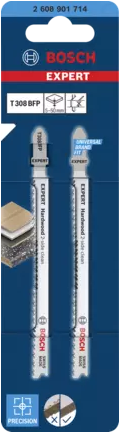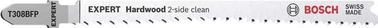 Bosch 2608901714 Stichsägeblatt EXPERT - Hohe Präzision für ausrissfreies Schneiden von laminierten Arbeitsplatten! Bi-Metall Blatt: Kombiniert harte Zähne mit flexiblem Blattkörper. Unter Tischlern und Schreinern war es schon immer eine Kunst sicherzustellen - dass der sichtbare Teil des Arbeitsmaterials die ¿saubere Seite¿ eines Stichsägenschnitts zeigt. Manchmal muss man das Werkstück zum Sägen umdrehen oder sägt von der Unterseite - um die gewünschte Schnittqualität auf der Sichtseite zu haben. Oder du verwendest das EXPERT `Hardwood 2-side clean¿ - welches dank seiner Zahngeometrie auf beiden Seiten einen perfekten - ausrissfreien Schnitt bietet. Hergestellt aus Bi-Metall ¿ einer Leiste aus Schnellarbeitsstahl - die auf ein flexibles Stahlblatt geschweisst wird - um Festigkeit und Flexibilität zu kombinieren ¿ ist das Bosch EXPERT 'Hardwood 2-side clean' Stichsägeblatt robust genug um beschichtete Küchenplatten aus Grobspanplatten oder Hartholz zu schneiden. Erhältlich für ausrissfreie gerade Schnitte (T308BF) und für besonders genaue ausrissfreie Winkelschnitte (T308BFP) Ausrissfreie Schnitte mit 2-side Clean Geometry. (2608901714)