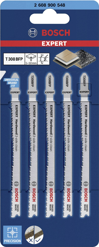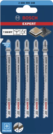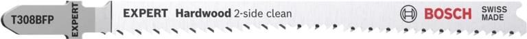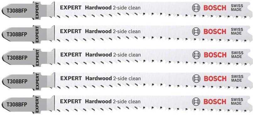 Bosch Expert Hardwood 2-side clean T308 BFP - Stichsägenblatt - für Hartholz, laminierte Spanplatte, Küchenarbeitsplatten, kunststoffbeschichtete Platte - 5 Stücke - T-Schaft - Länge: 117 mm
