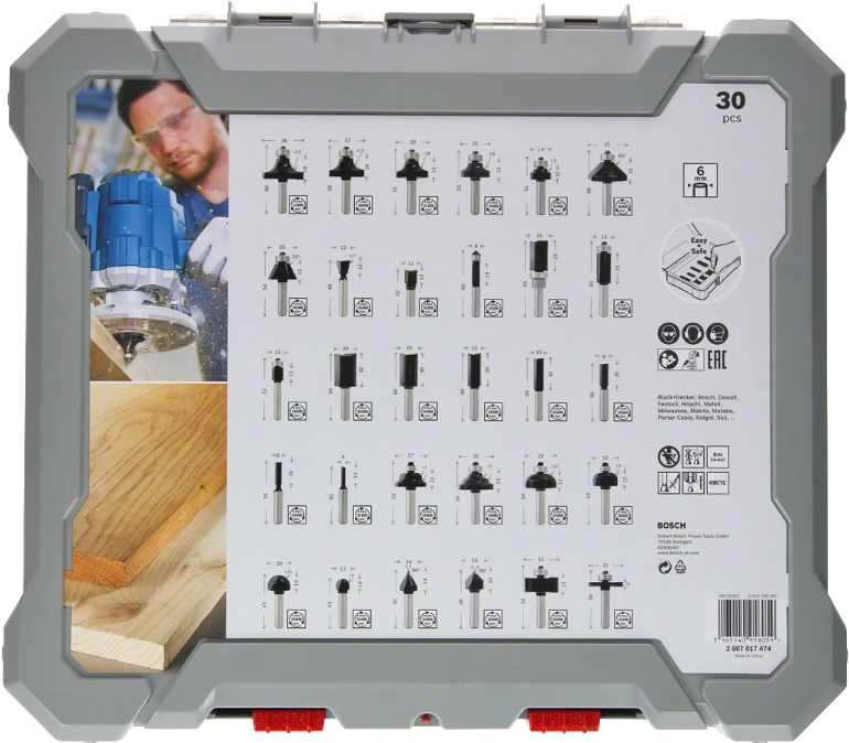 Das Fräser-Set eignet sich für Feinbearbeitung in zahlreichen Anwendungsbereichen und ist so die perfekte Wahl für alle, die mit Holz arbeiten, wie Schreiner, Zimmerleute, Innenausbauer und andere Bauhandwerker. Die Carbide-Schneiden der Fräser gewährleisten eine lange Lebensdauer, und dank der verschiedenen Fräsergeometrien lässt sich eine große Vielfalt von Profilen in viele verschiedene Materialien fräsen. Zudem sind sie gemäß Sicherheitsstandards entsprechend DIN EN-847 gefertigt. Die Fräser sind für die Bearbeitung von Weich- und Hartholz sowie Holzverbundstoffen vorgesehen. Das Set ist in drei Ausführungen mit 6 mm, 8 mm oder ¼ Zoll Schaftdurchmesser erhältlich. Damit ist ein passendes Set für alle gängigen Handfräsen verfügbar. Das Fräser-Set verfügt über eine spezielle „Easy-Pick“-Einlage, die die schnelle und sichere Entnahme der Fräser am Schaft ermöglicht. Zum Set gehört ein exklusiver und äußerst robuster Kasten, in dem die Fräser fest und sicher untergebracht sind und der den Inhalt bei Lagerung und Transport perfekt schützt. Durch den Klarsichtdeckel ist der Inhalt zudem sichtbar.