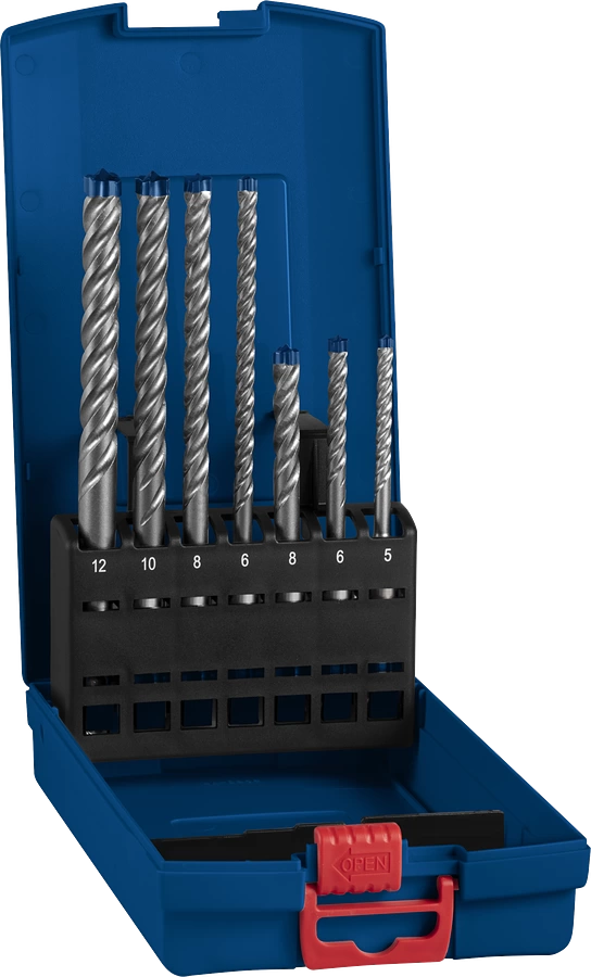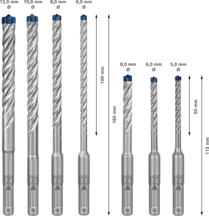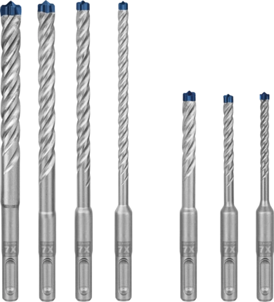 EXPERT SDS plus-7X Hammerbohrer-Set, 5/6/6/8/8/10/12 mm, 7-tlg.Hält bis zu 3-mal länger als StandardbohrerExtrem belastbare Bohrerspitze mit Bosch Carbide Technology.Passend für alle SDS plus Bohrhämmer.Ideal zum Bohren von Löchern in