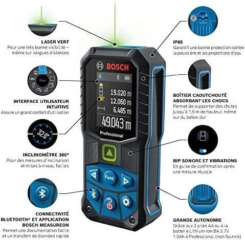 Der Laser-Entfernungsmesser GLM 50-27 CG Professional bietet eine hervorragende Sichtbarkeit des Laserpunkts, ein sehr langlebiges Design und eine schnelle Dokumentation. Da sein grüner Laserpunkt im Vergleich zu einem roten Laserpunkt besser zu sehen ist, eignet er sich besonders zum Messen großer Distanzen bei hellen Innenraumbedingungen. Dank der Kombination aus einem IP65-zertifizierten Design und einem stoßabsorbierenden Gehäuse mit Gummiummantelung hält es Stürze aus 1,5 Meter Höhe, sogar auf harten Beton und auf rauen Baustellen aus. Bluetooth -Konnektivität und die Bosch MeasureOn App gewährleisten eine zügige Dokumentation und blitzschnelle Übertragung der Messergebnisse.Dieser Laser-Entfernungsmesser eignet sich optimal zum Dokumentieren, Berechnen des Materialbedarfs, Berechnen von Räumen und Wandflächen und Positionieren von Befestigungselementen, und ist somit ideal für Architekten, Elektriker und viele andere professionelle Anwender.Das Gerät gibt sowohl ein Akustik- als auch Vibrationssignal zur Bestätigung einer erfolgreichen Messung und bietet eine längere Akkulaufzeit (im Vergleich zum Vorgänger GLM 50 C Professional).