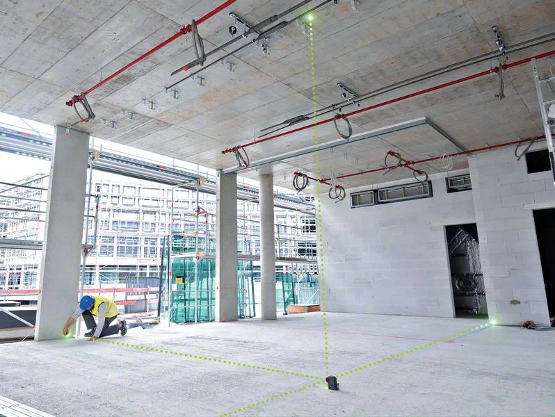 Der 5-Punkt-Laser GPL 5 G Professional überzeugt mit seinem strapazierfähigen und kompakten Design und ist die ideale Wahl für Übertragungen bei Wänden mit 90-Grad-Winkel. Seine grünen Laserpunkte bieten eine bis zu viermal bessere Sichtbarkeit als rote Punkte. Mit seinem gummiummantelten Gehäuse und dem eingelassenen Glas sowie Staub- und Spritzwasserschutz nach IP 65 eignet sich der GPL 5 G Professional auch für raue Baustellenbedingungen. Dieser 5-Punkt-Laser ist in kürzester Zeit transportbereit dank der eingebauten Drehhalterung mit starken Magneten für eine schnelle und sichere Werkzeugbefestigung.Der GPL 5 G Professional ist ideal für die Raumaufteilung mit 90-Grad-Winkeln und die Übertragung von Referenzpunkten vom Boden zur Decke. Er eignet sich sehr gut für Klempnerarbeiten und die Errichtung von Trockenbauwandrahmen.Dieser 5-Punkt-Laser verfügt auch über ein benutzerfreundliches Interface mit einem Zweipositionsschalter: Beim Einschalten nivelliert der Laser sich automatisch selbst, beim Ausschalten wird die Pendelarretierung aktiviert.