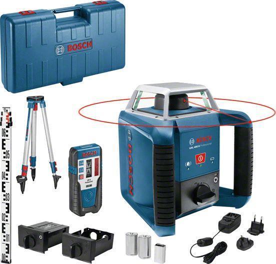 Bosch GRL 400 H Professional. Typ: Dreh-Ebene, Produktfarbe: Blau, Stativgewinde: 5/8" . Maximale Reichweite: 400 m, Levelling Präzision (±): 0,08 mm/m, Selbst-levelling Range (±): 5°. Operationszeit: 30 h, Batterietechnologie: Nickel-Metallhydrid (NiMH), Batteriespannung: 1,2 V. Breite: 180 mm, Tiefe: 190 mm, Höhe: 170 mm (0 615 994 03U)