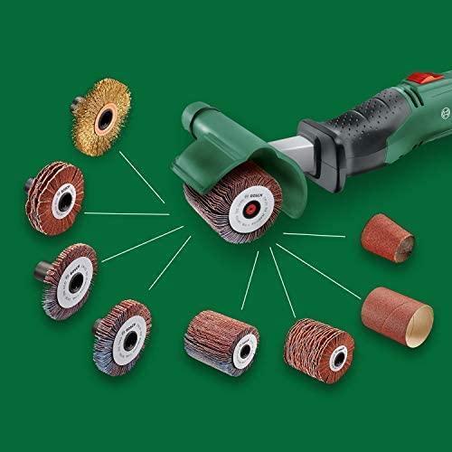 Der Schleifroller eignet sich perfekt zum Schleifen von gewölbten, profilierten und strukturierten Holz- oder Metalloberflächen. Er erreicht schwer zugängliche Bereiche und schleift mühelos Geländer, profilierte Sockelleisten, Garagentore und Möbel mit Kontur. Die elektronische Drehzahlvorwahl und ein umfassendes Zubehörsortiment ermöglichen verschiedenste Anwendungen bei vielen Materialien. Er verfügt über Bosch SDS und Autolock für einen schnellen und einfachen Zubehörwechsel, einen zylindrischen Griff mit Softgrip für eine bequeme Handhabung sowie eine Staubabsaugung für staubarmes Arbeiten.
