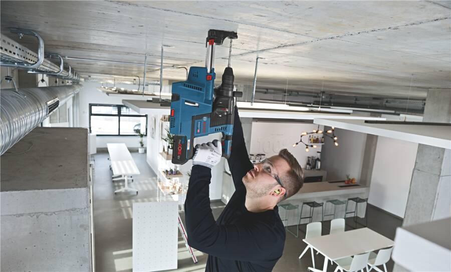 Der kabellose GDE 18V-16 Professional ist das optimale Staubmanagementsystem. Er verfügt über einen HEPA-Filter zur Staubaufnahme, der 99,97 % aller Partikel größer als 0,3 Mikrometer beseitigt. Diese Staubabsaugung besitzt eine Auto-Power-Funktion, die sich beim Bohren automatisch einschaltet und zwei Sekunden nach Freigabe des Bohrhammerschalters abschaltet.