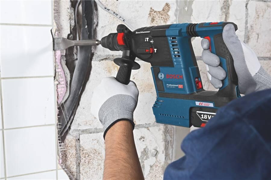 Der GBH 18V-26 F Professional mit Schnellspannbohrfutter ist der Allrounder im Bosch SDS plus Akku-Bohrhammer Segment und damit ideal für den täglichen Einsatz. Die zusätzliche Staubabsaugung GDE 18V-16 Professional kann mit dem Bohrhammer kombiniert werden und bietet eine in sich geschlossene HEPA-Staublösung für maximale Mobilität. Der Bohrhammer verfügt außerdem über KickBack Control und Electronic Precision Control (EPC) für eine bessere Handhabung und erhöhten Anwenderschutz. Sein leistungsstarker Motor liefert 2,6 Joule Schlagenergie und eine hohe Abtragsleistung.