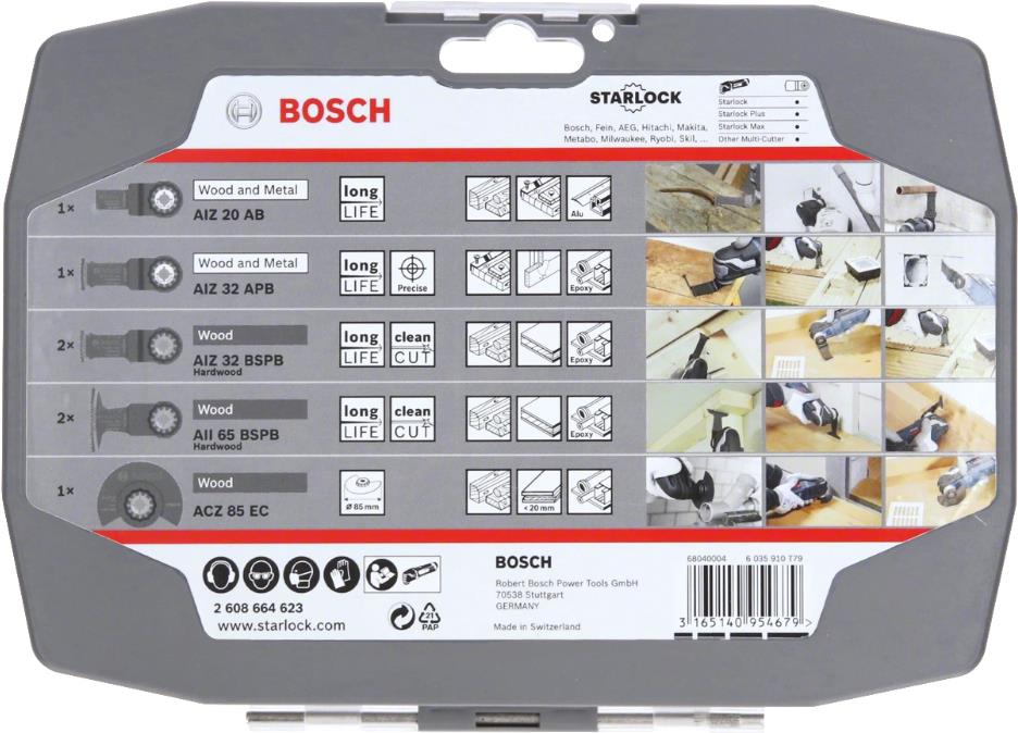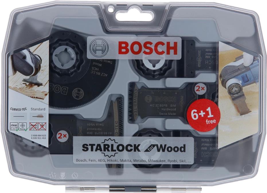 Das Segmentsägeblatt Starlock ACZ 85 EC ermöglicht zuverlässig Schnitte in Holz. Das Tauchsägeblatt Starlock AII 65 BSPB hat bei breiten Tauchschnitten in Hartholz eine hohe Lebensdauer.? Das Sägeblatt Starlock AIZ 32 APB ermöglicht präzise bündige Schnitte und tiefe Tauchschnitte in Holz, Metall und Kunststoff. Das Tauchsägeblatt Starlock AIZ 32 BSPB hat bei Arbeiten mit Hartholz eine hohe Lebensdauer. Das Tauchsägeblatt Starlock AIZ 20 AB ermöglicht Feinschnitte in Holz und ungehärtetes Metall.
