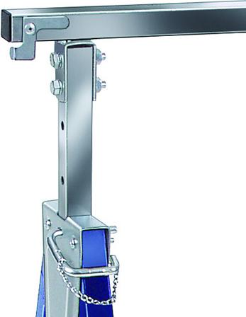 - Höhenverstellbarer Gerüstbock mit ausklappbaren Rasthaken gegen seitliches Abrutschen der Arbeitsplatte (max. 64 cm breit)