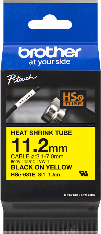 Brother HSe-631E - Schwarz auf Gelb - Roll (1.12 cm x 1.5 m) 1 Kassette(n) Hängebox - Schrumpfschlauch-Band - für P-Touch PT-D800W, PT-E300, PT-E300VP, PT-E550WVP, PT-P700, PT-P750W, PT-P900W, PT-P950NW
