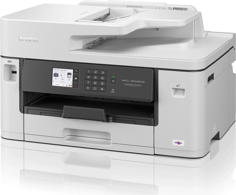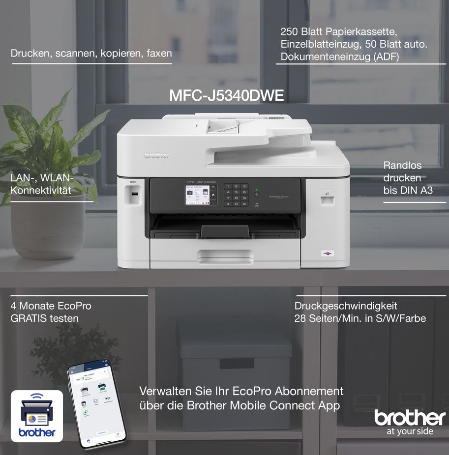 Das 4-in-1 Tinten-Multifunktionsgerät MFC-J5340DW mit DIN A3 Druckfunktion erfüllt die Anforderungen anspruchsvoller kleiner Büros und Arbeitsgruppen. Dank DIN A3 Druckfunktion können Sie problemlos eine Vielzahl von A3- und A4-Farbdokumenten erstellen. Genießen Sie dabei hochwertige Qualität, schnelle Druckgeschwindigkeiten und niedrige Betriebskosten. Dieses Multifunktionsgerät bietet eine Druck-, Kopier-, Scan- und Faxfunktion. Drucken Sie direkt von Ihrem Arbeitsplatz, einem Besprechungsraum oder Ihrem Mobilgerät aus - dank drahtloser WLAN-Verbindung.