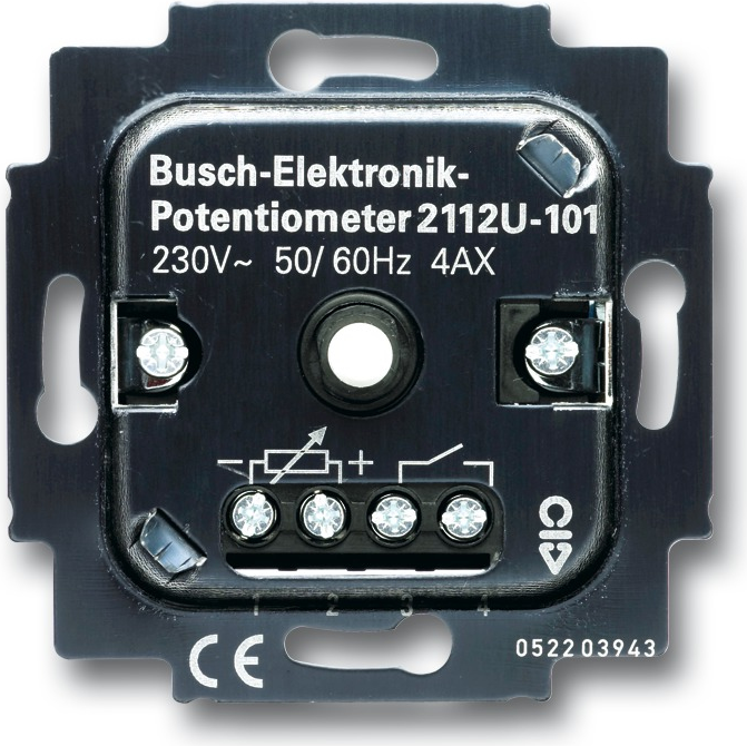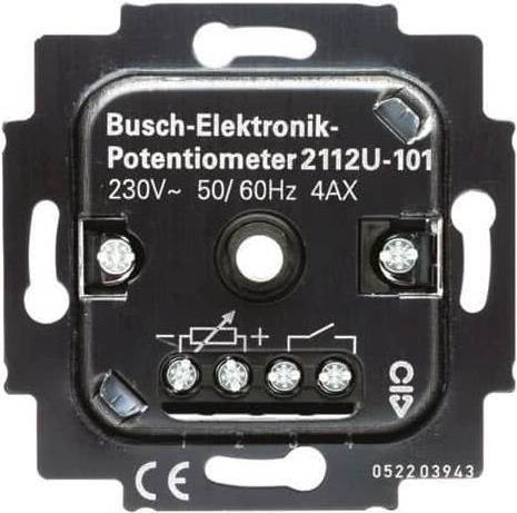 Busch-Jaeger 2112 U-101. Typ: Dimmer. Bauform: Eingebaut, Steuerung: Drehregler, Produktfarbe: Schwarz. AC Eingangsspannung: 230 V, AC Eingangsfrequenz: 50/60 Hz. Breite: 71 mm, Tiefe: 33 mm, Höhe: 71 mm (6599-0-2035)
