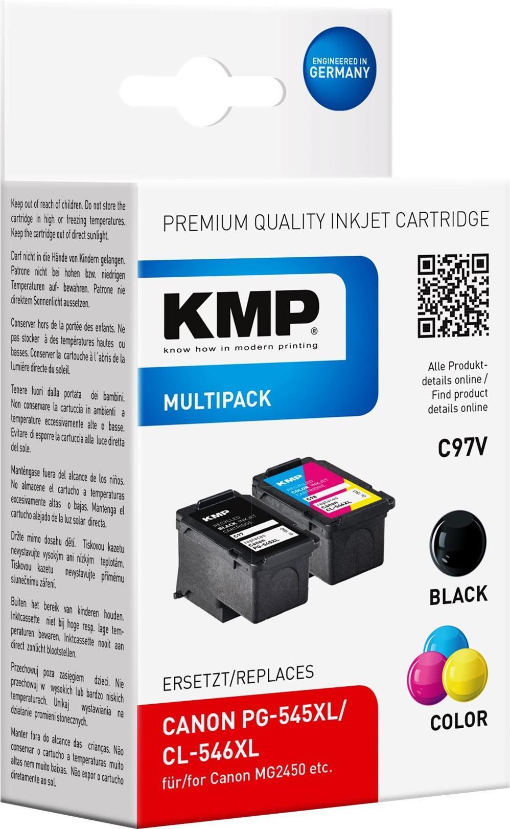 | Produktbeschreibung | KMP MULTIPACK C97V - 2er-Pack - Hohe Ergiebigkeit - Schwarz, Farbe (Cyan, Magenta, Gelb) - kompatibel - Tintenpatrone (Alternative zu: Canon 8286B001, Canon 8288B001, Canon CL-546XL, Canon PG-545XL) |