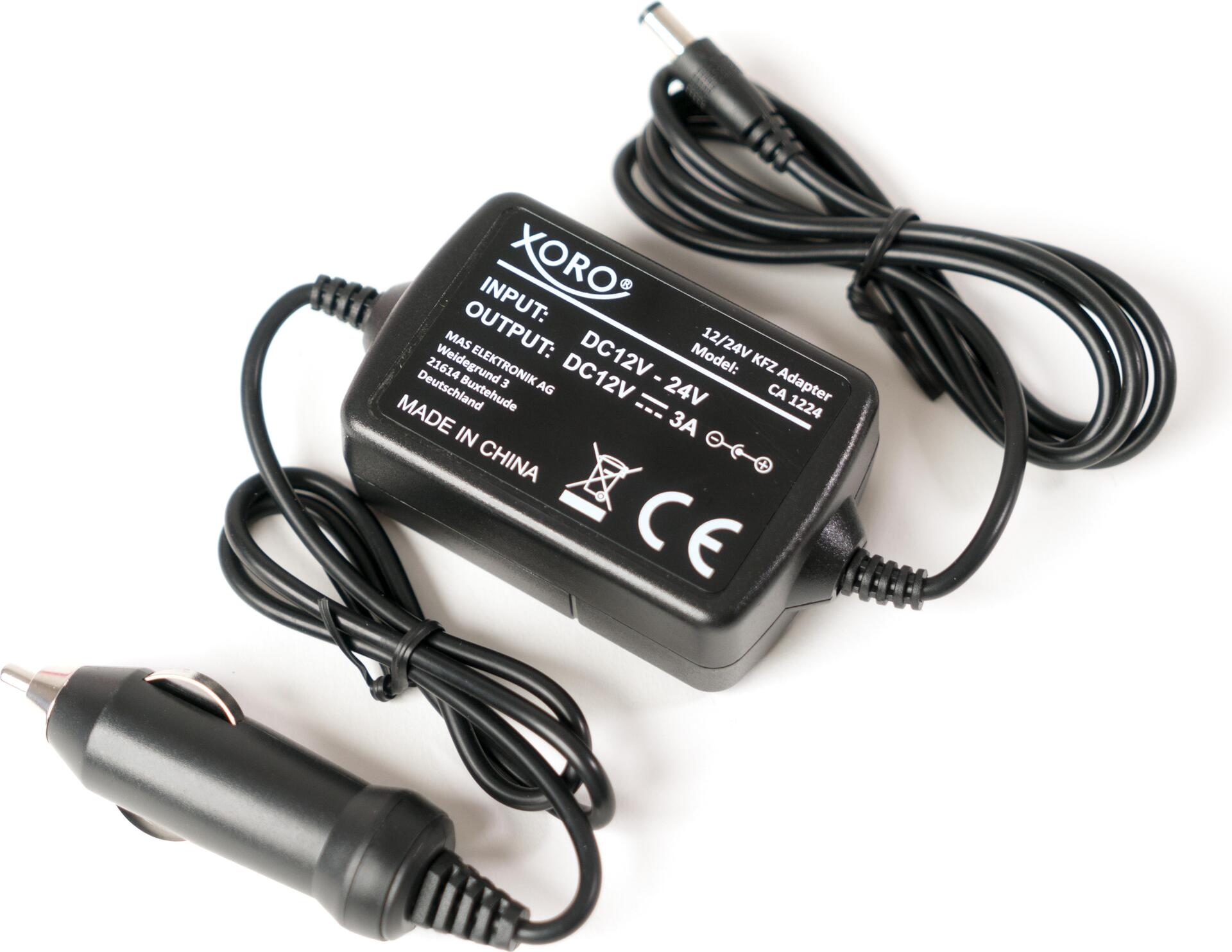 Produkttext[/head]Der XORO CA1224 ist ein hochwertiger Spannungsadapter für den mobilen Einsatz von Geräten mit 12V Spannungsversorgung. Ein intelligenter Chip erkennt das angeschlossene Gerät und liefert automatisch die optimale Spannung bzw. die benötigte Stromstärke. Die integrierte Spannungsstabilisierung erkennt Spannungsspitzen im Bordnetz und schützt angeschlossene Geräte vor Überspannungen. Das Gerät kann im 12V oder 24V Bordnetz betrieben werden!Das Gerät ist das perfekte Zubehör für unsere Xoro HTL/HTC Fernseher-Serie und durch den handelsüblichen Hohlstecker auch universell einsetzbar (Receiver, IP Boxen, ect.)[head]Hauptmerkmale