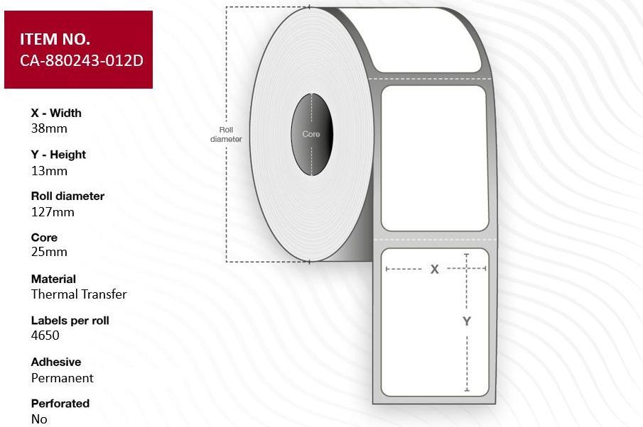 • Capture Label 38 x 18mm, Core 25mm, Permanent, No perforation, 4650 labels per roll, 12 rolls per box (CA-880243-012D)