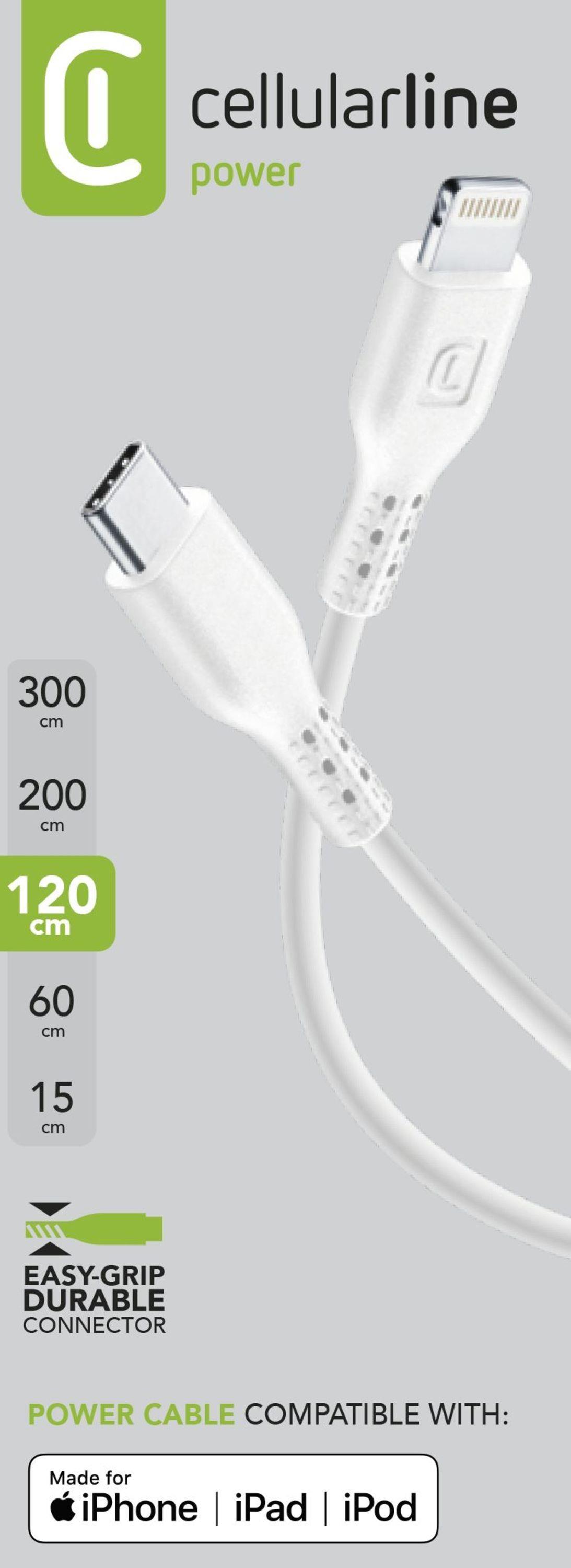 Cellularline USBDATAC2LMFI1MW. Kabellänge: 1,2 m, Anschluss 1: Lightning, Anschluss 2: USB C. Menge pro Packung: 1 Stück(e), Verpackungsbreite: 90 mm, Verpackungstiefe: 24 mm (USBDATAC2LMFI1MW)