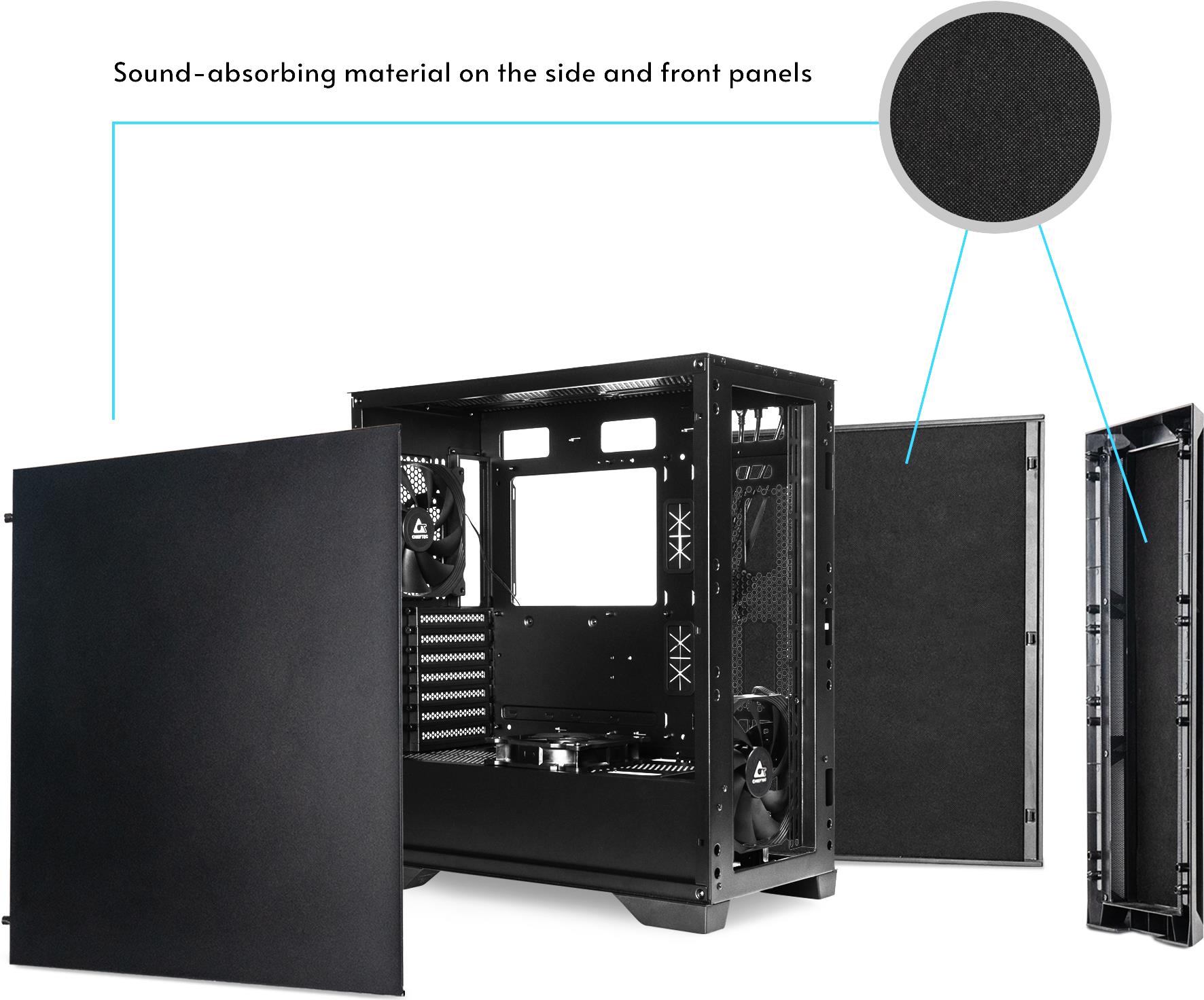 | Systemgehäuse-Merkmale | Geräuschdämpfendes Frontpanel, schalldämpfende Seitenteile |