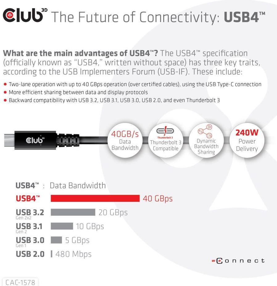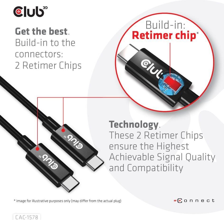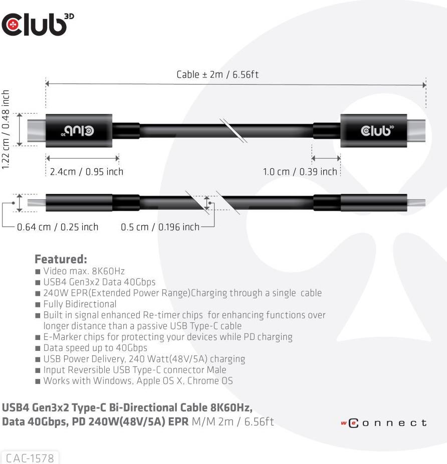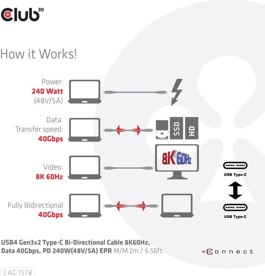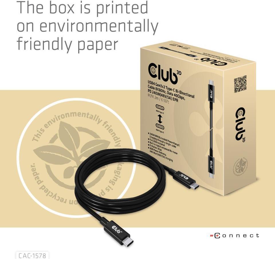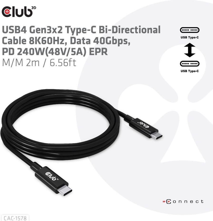 Club 3D - USB-Kabel - 24 pin USB-C (M) zu 24 pin USB-C (M) - USB4 Gen3x2 5 A - 2,0m - Support von 8K 60 Hz, bi-direktional, Baureihe mit erweitertem Leistungsbereich (EPR, USB-Stromversorgung (240 W), bis zu 40 Gbps Datentransferrate (CAC-1578)