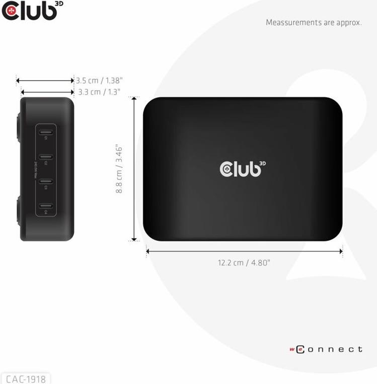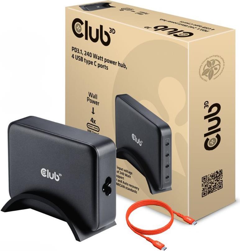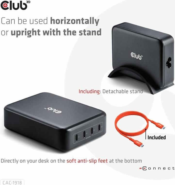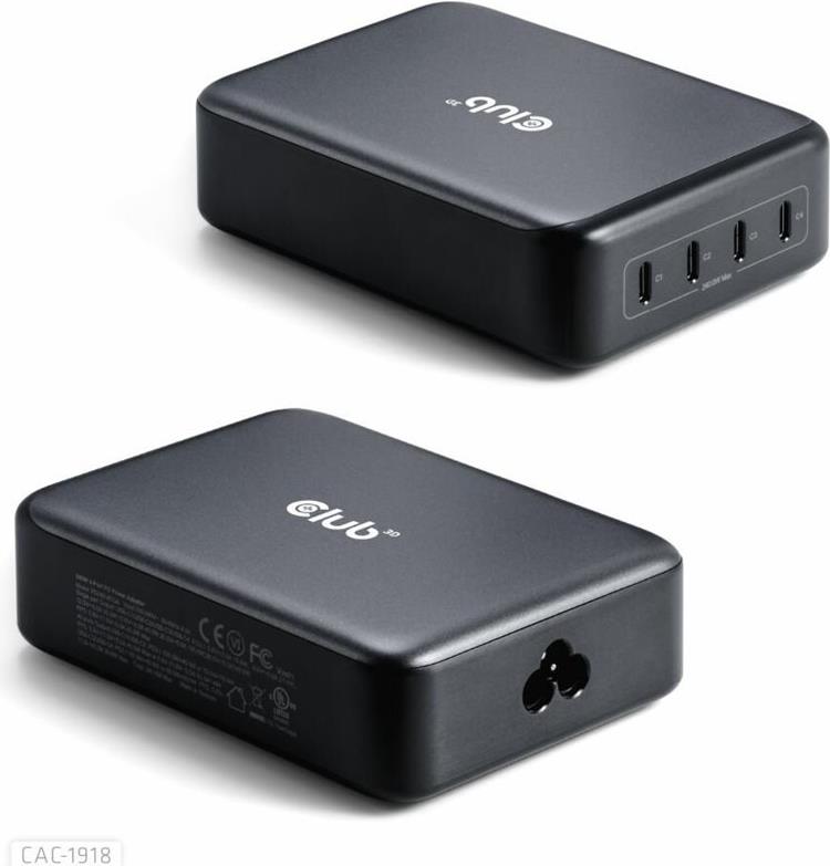Der Club 3D CAC-1918 Netzadapter ist vielseitig einsetzbar und eignet sich für Tablets, Mobiltelefone und Notebooks. Mit einem 1,5 m langen Netzkabel und vier 24-poligen USB-C-Ausgangsanschlüssen ermöglicht dieses Reiseladegerät das gleichzeitige Laden mehrerer Geräte ohne Leistungseinbußen. Ausgestattet mit GaN-Technologie, liefert dieser Adapter effizient 240 Watt Leistung, während er ein kompaktes und tragbares Design beibehält.