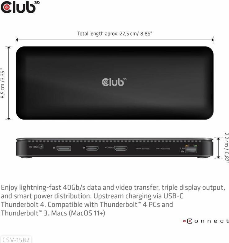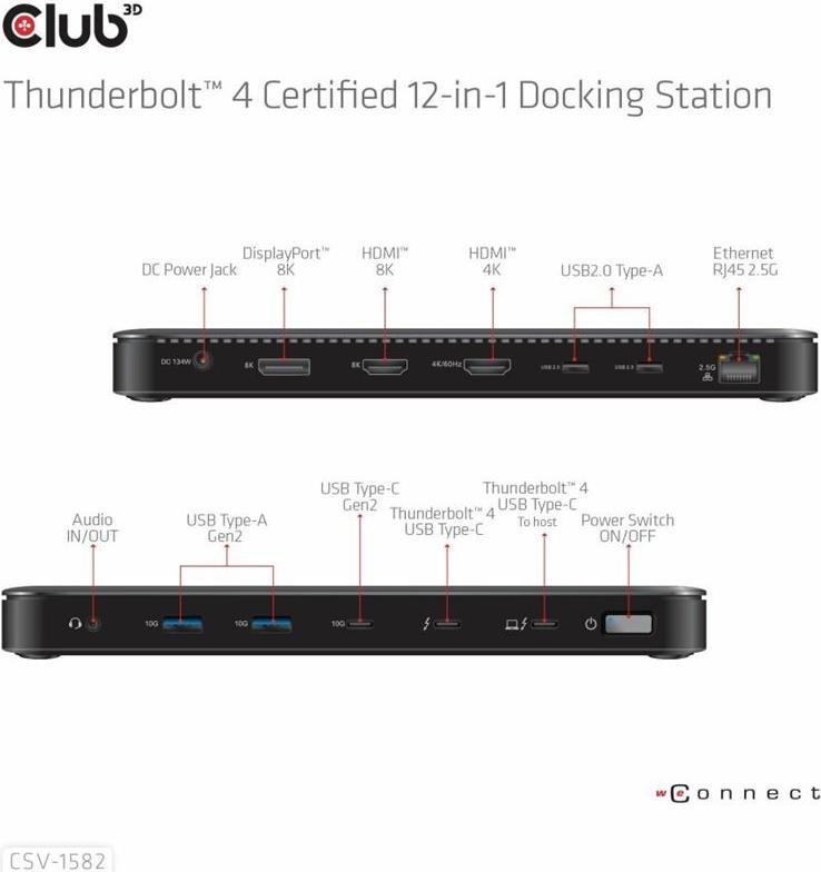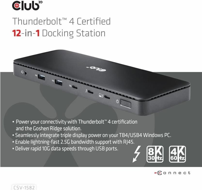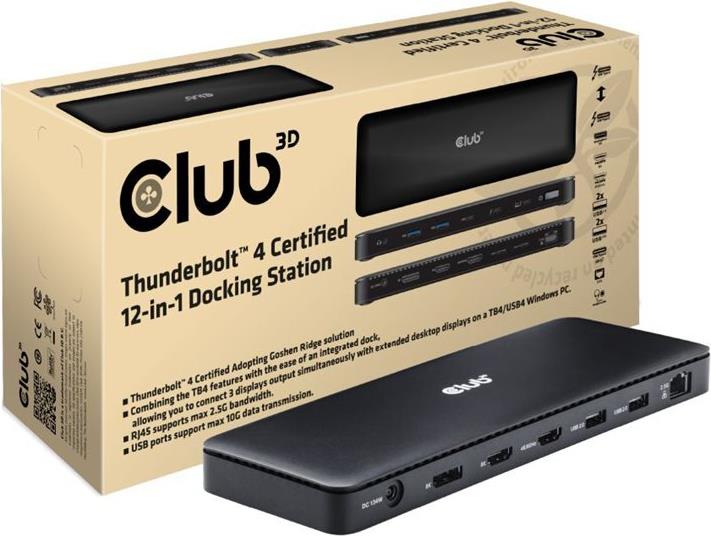 | Produktbeschreibung | Club 3D 12-in-1 - Dockingstation - USB-C / USB4 / Thunderbolt 3 / Thunderbolt 4 - 2 x HDMI, DP, Thunderbolt 4 - 2.5GbE |