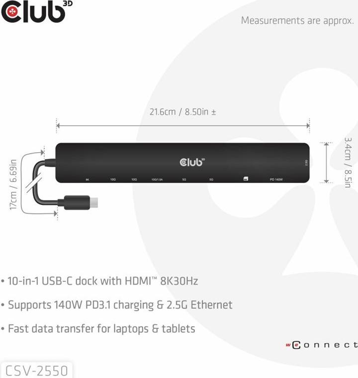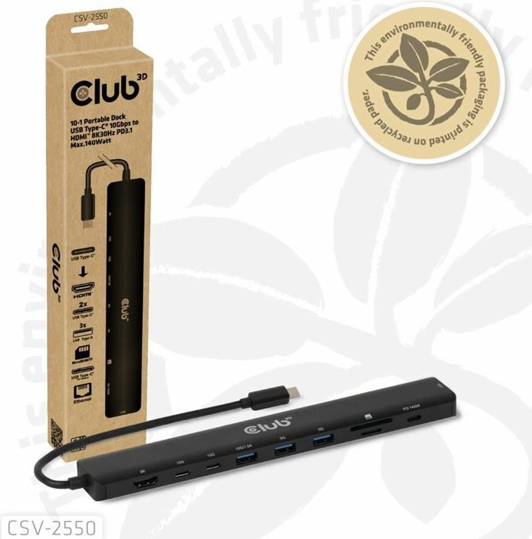 Die Club 3D 10-in-1-Dockingstation ist ein vielseitiges Zubehörteil, das mit zahlreichen Anschlussmöglichkeiten für mehr Produktivität sorgt. Mit einem kompakten, im Design integrierten 19-cm-USB-C-Kabel lässt sich diese Dockingstation einfach an einen Laptop oder Desktop anschließen und bietet eine Reihe von Schnittstellen, darunter HDMI, USB-A und USB-C mit Power Delivery-Funktion. Die Dockingstation unterstützt Bildschirmauflösungen von bis zu 8K bei verschiedenen Bildwiederholraten und sorgt so für klare Bilder bei jedem Projekt oder jeder Präsentation. Diese Dockingstation ist mit SD- und microSD-Speicherkartensteckplätzen ausgestattet, die eine einfache Datenübertragung ermöglichen. Dank der Netzwerkkonnektivität über 2,5-Gigabit-Ethernet ermöglicht sie einen schnellen Internetzugang, während zwei USB-C-Ausgänge das gleichzeitige Laden von Geräten ermöglichen. Die Club 3D 10-in-1-Dockingstation wurde in Übereinstimmung mit verschiedenen Standards wie FCC und RoHS entwickelt und gewährleistet eine zuverlässige Leistung bei minimaler Umweltbelastung.