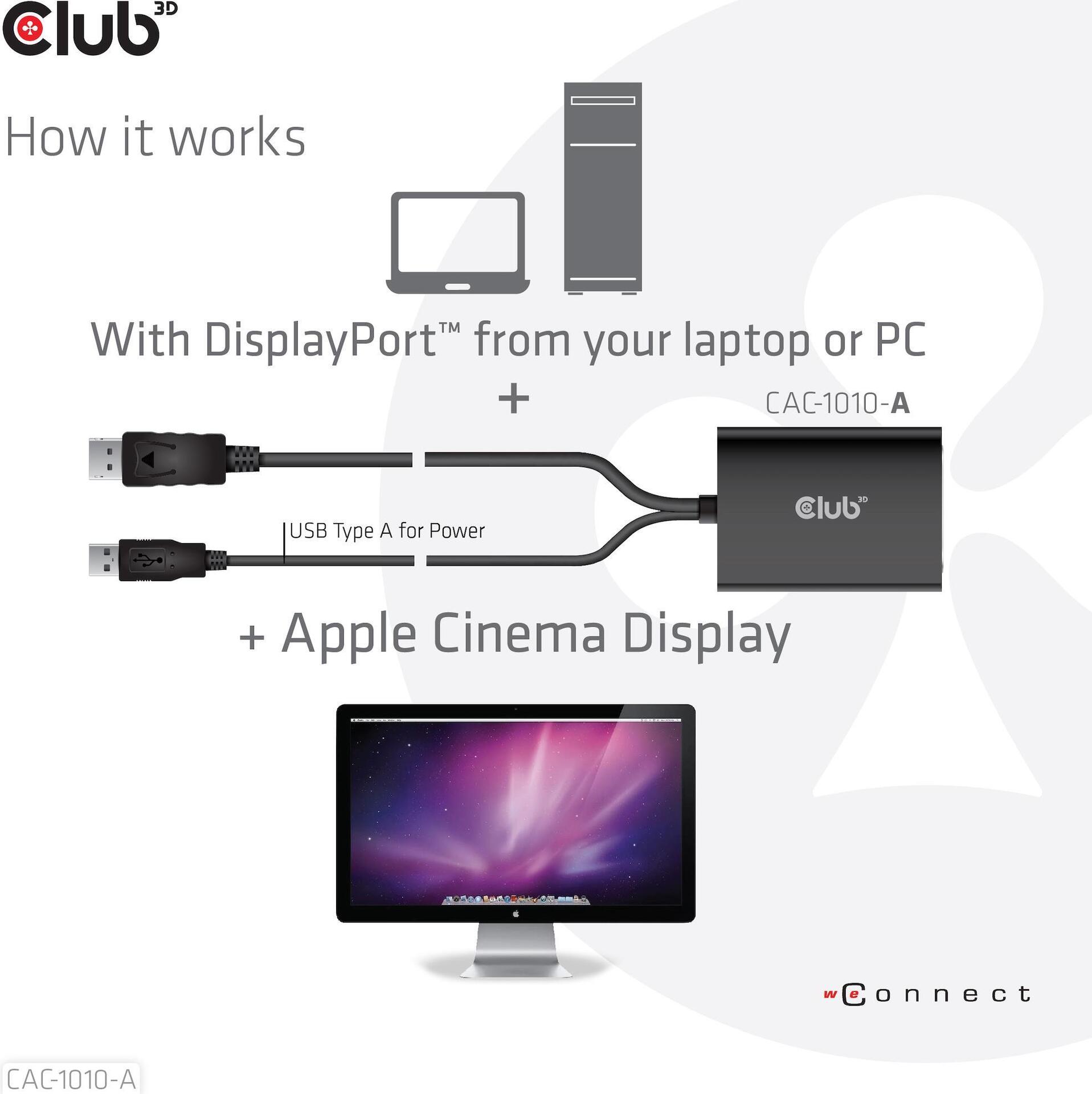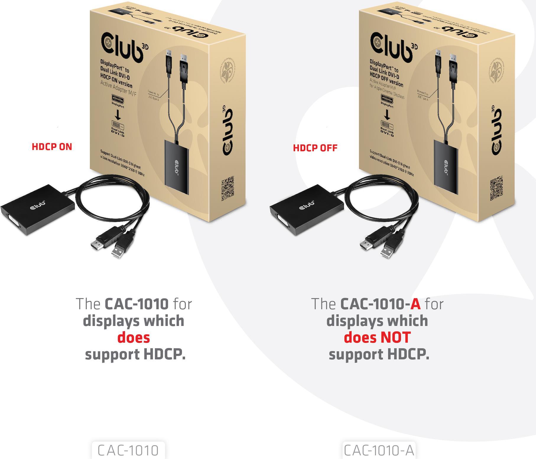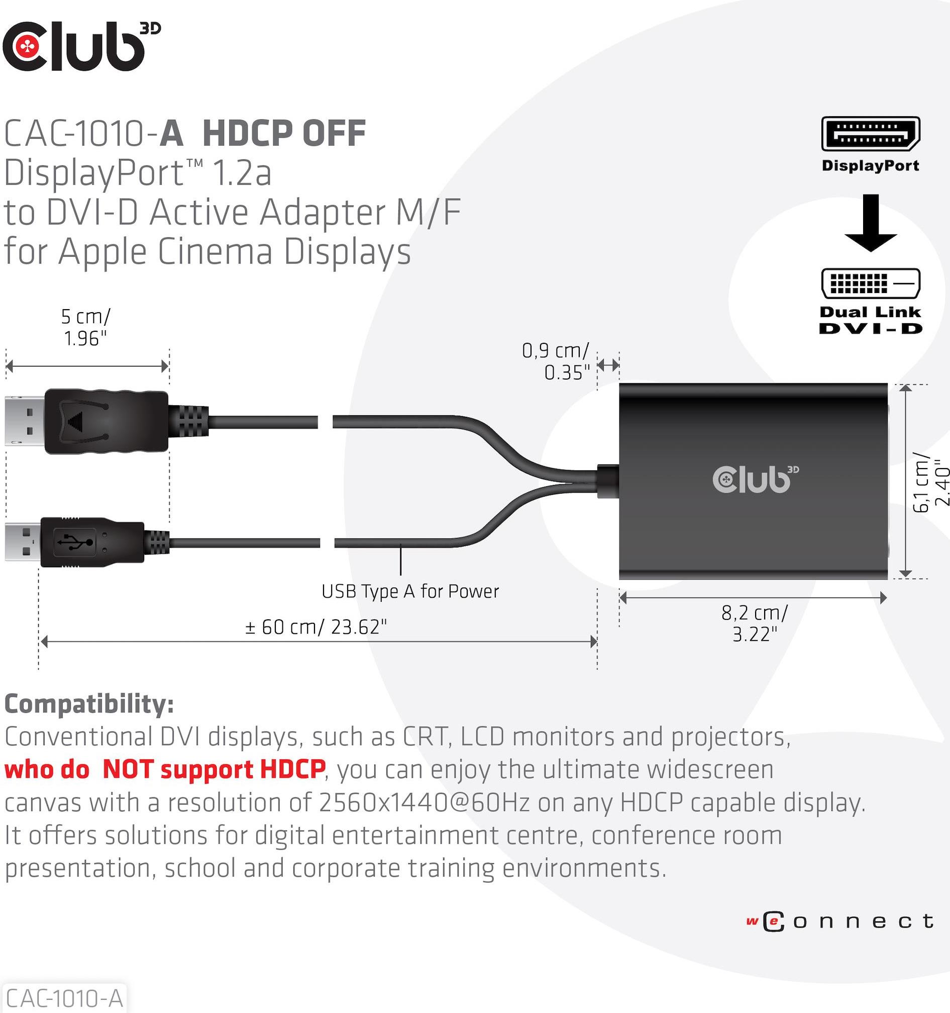 Der Club 3D CAC-1010-A aktive DisplayPort + USB Typ-A auf Dual Link DVI-D HDCP OFF Version Adapter für Apple Cinema Displays oder andere Displays ohne HDCP Unterstützung, der nahtlos eine mit DisplayPort ausgestattete Quelle mit konventionellen DVI Displays verbindet, wie z. B. CRT bzw. LCD Monitoren und Projektoren, die ohne HDCP Unterstützung arbeiten. Sie können die ultimative Widescreen-Fläche mit einer Auflösung von 2560x1440@60 Hz auf jedem nicht-HDCP fähigen Display genießen. So werden Lösungen für digitale Unterhaltungszentren, Konferenzraumpräsentationen, Schulen und Schulungsumgebungen für Firmen ermöglicht.