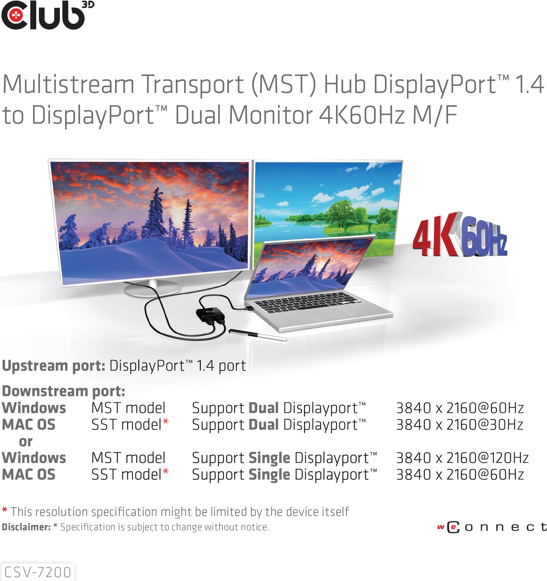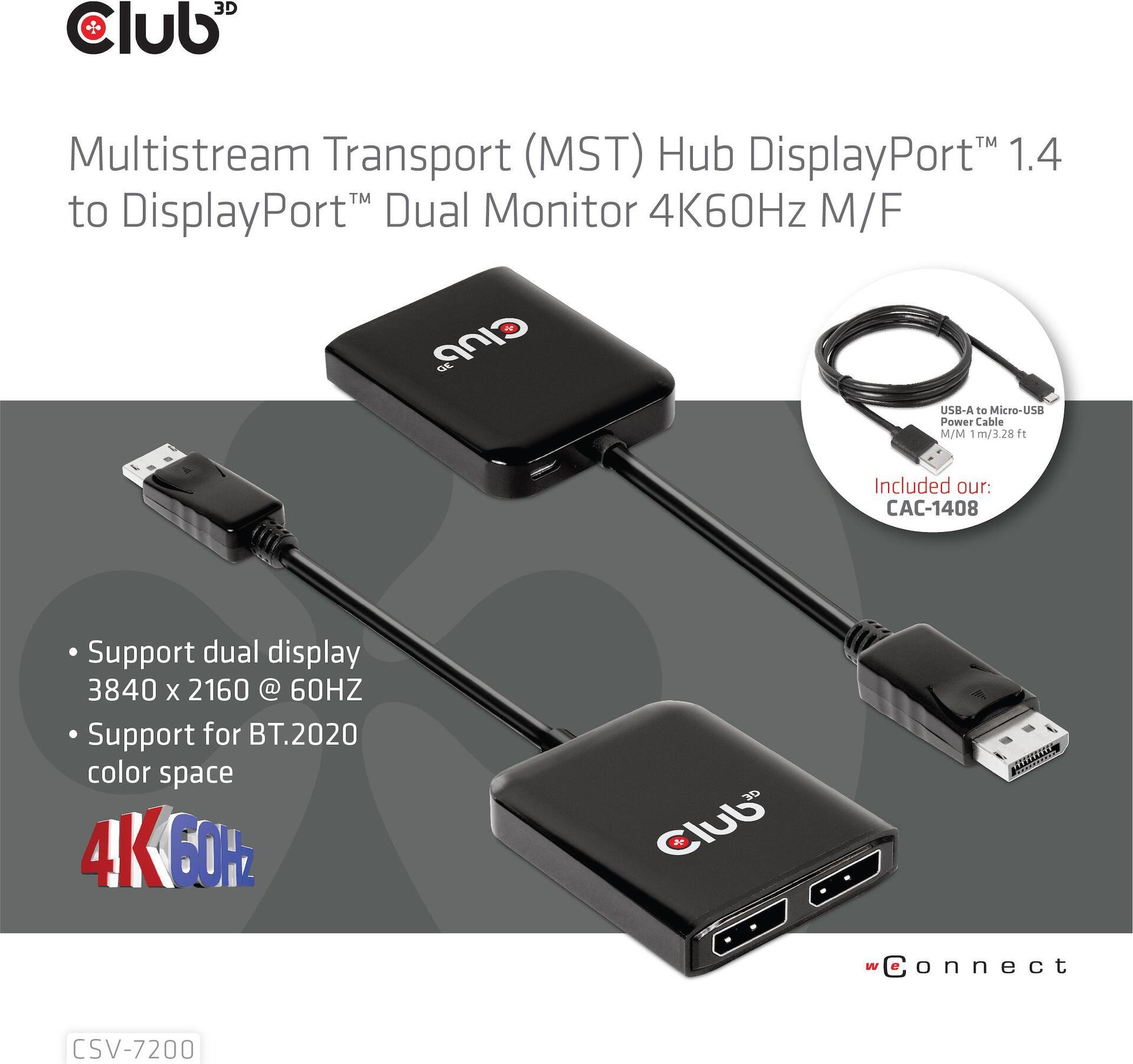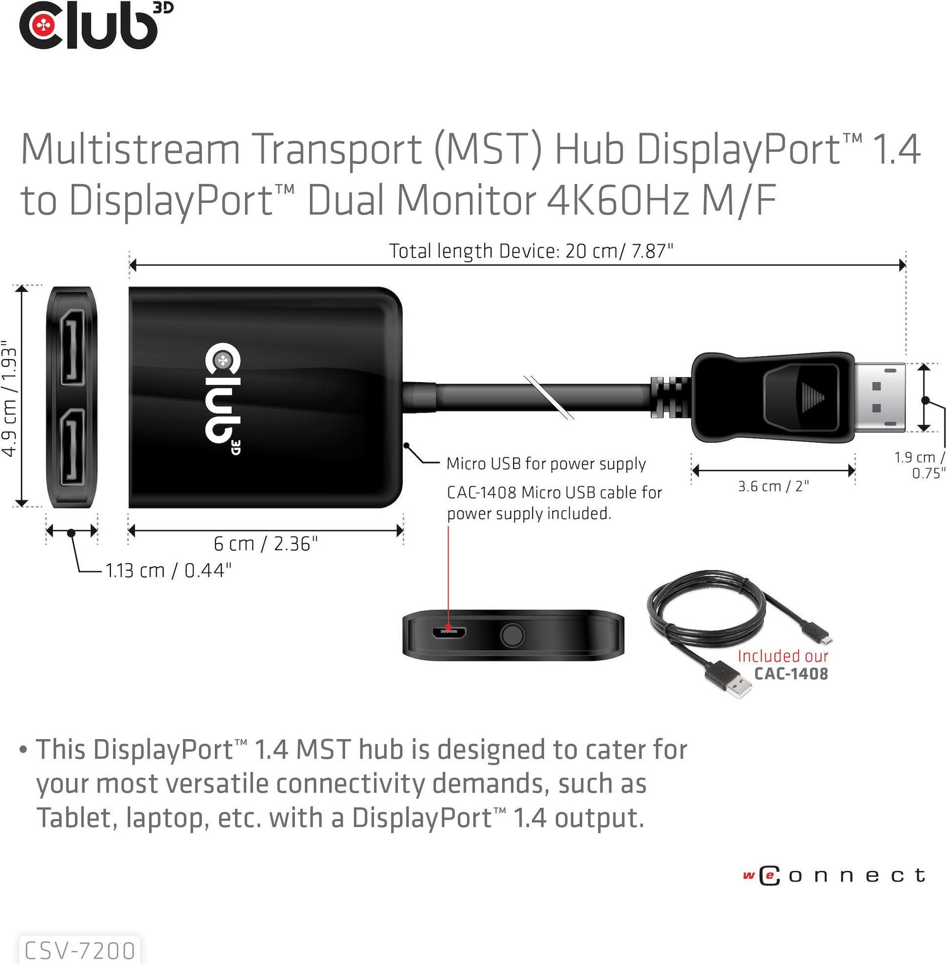 Der CSV-7220 ist ein MST Hub mit DisplayPort 1.4 auf DisplayPort + HDMI 4K@60 Hz M/F. Schließen Sie mehrere Displays an Ihr Ultrabook an. Ultrabooks und Notebooks werden immer leistungsfähiger und dabei gleichzeitig schlanker in der Bauweise. Mit einem einzigen verfügbaren DP 1.4 Ausgang können Sie nun gleichzeitig einen DisplayPort Bildschirm und ein HDMI 2.0 Display mit 4K@60 Hz oder ein DP Display mit 8K@30 Hz im MST Modus (Windows) betreiben. Dafür ist lediglich ein freier DP 1.4 Port an Ihrem Laptop oder Ultrabook notwendig, um Ihren MST Hub zu verbinden. Sie erhalten bisher noch nicht mögliche Verbindungsoptionen für Dual 4K@60 Hz Displays. Wenn Ihr System diese Funktion unterstützt, ist das Setup einfach und schnell erledigt. Der CSV-7220 wird extern über ein USB Typ-A auf Micro USB Kabel mit Strom versorgt, welches zum Lieferumfang gehört.