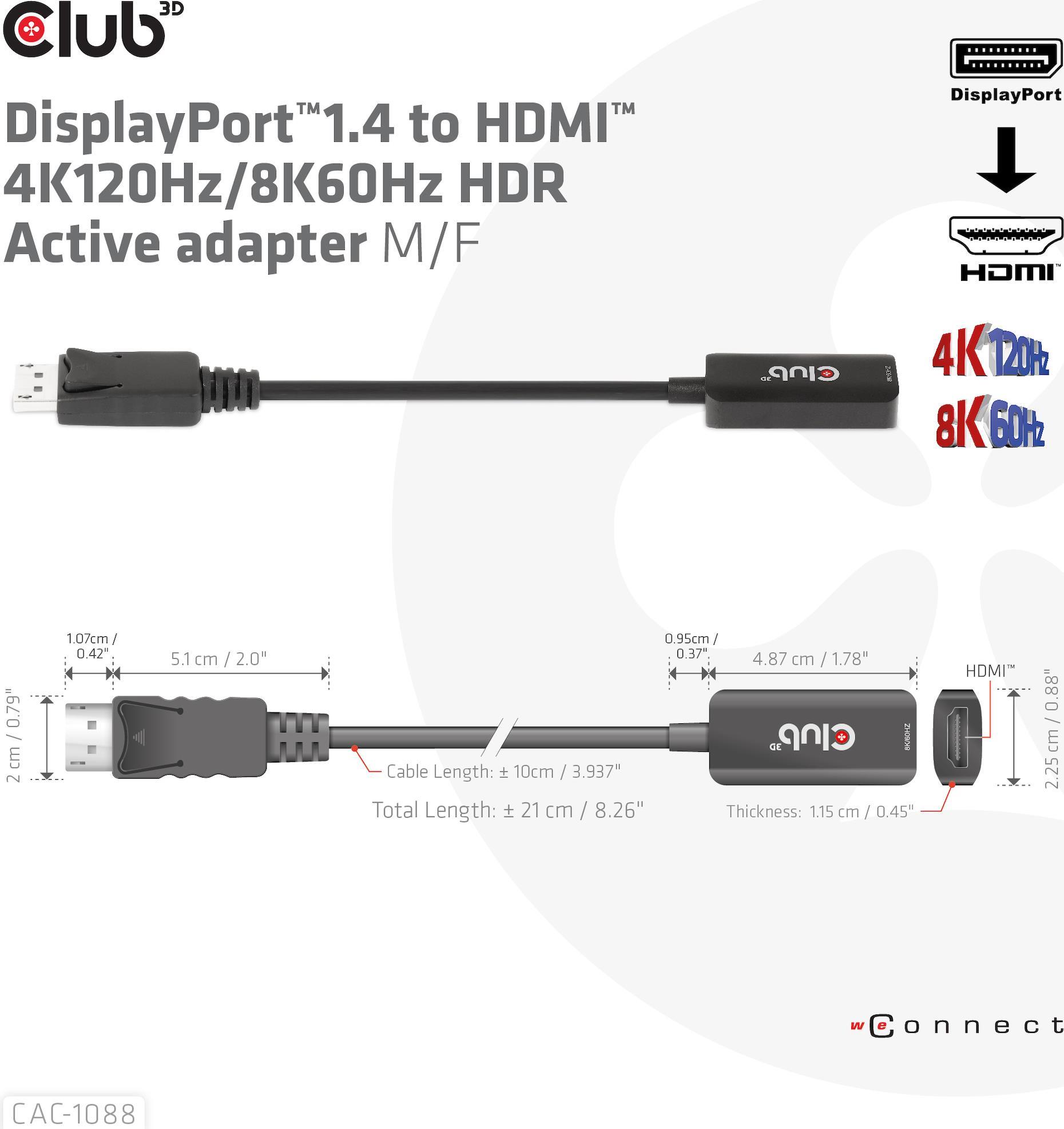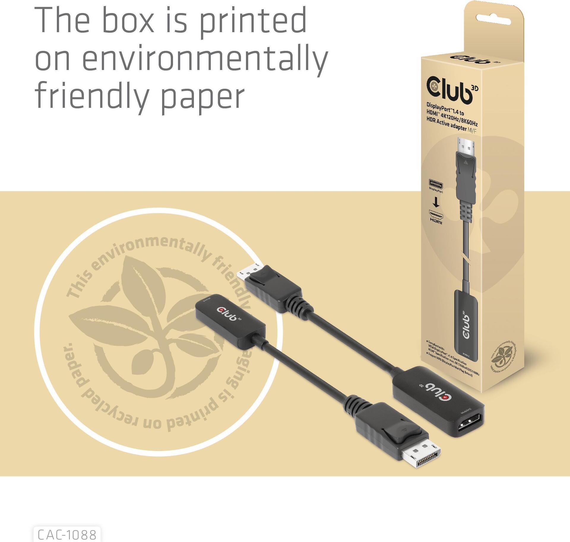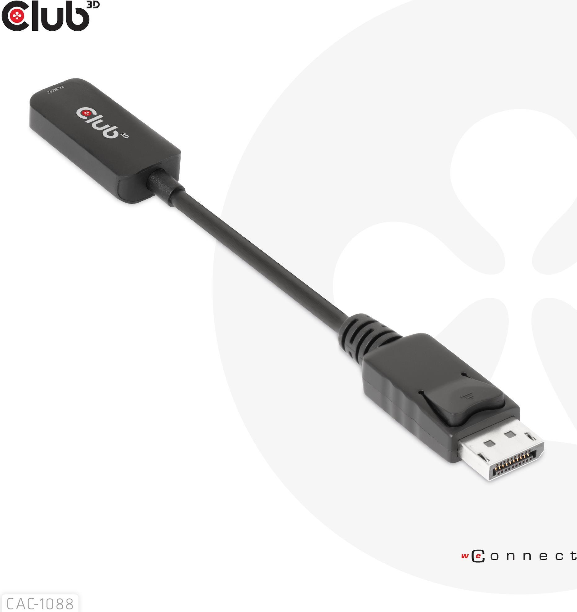 Club 3D - Videoadapter - DisplayPort männlich zu HDMI weiblich - 10 cm - aktiv, Support von 4K 120 Hz, unidirektional, unterstützt 8K 60 Hz (7680 x 4320)