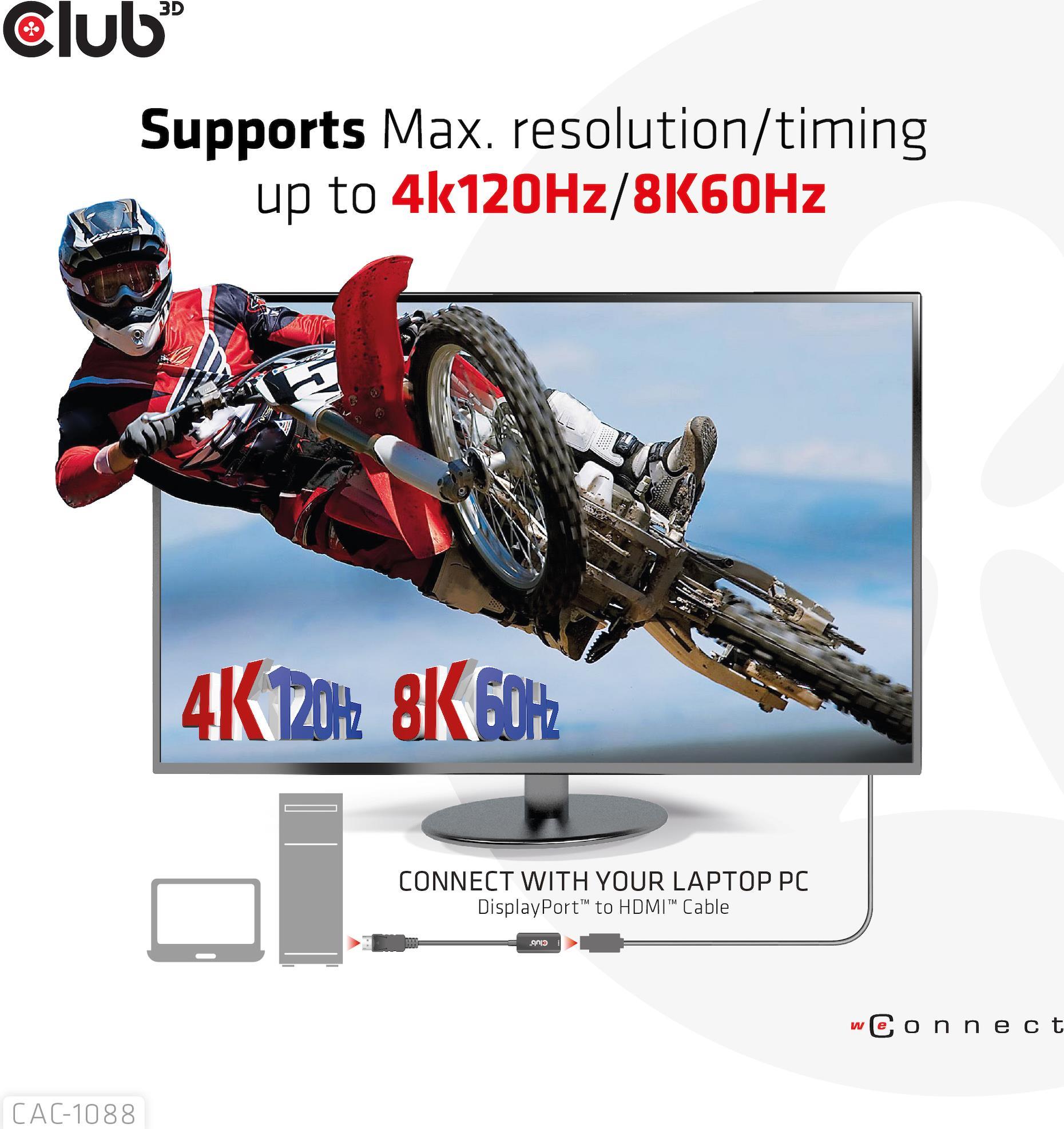 Der Club 3D CAC-1088 ist die perfekte Lösung für den Anschluss an alle HDMI 4K 120 Hz/8K 60 Hz fähigen Displays. Wenn Sie einen DisplayPort 1.4-fähigen PC oder ein anderes Gerät haben, dem die HDMI 4K 120 Hz/8K 60 Hz-Spezifikation fehlt, ist der Club3D CAC-1088 die einfache Möglichkeit, Ihr Gerät aufzurüsten und an Ihren Fernseher anzuschließen.
