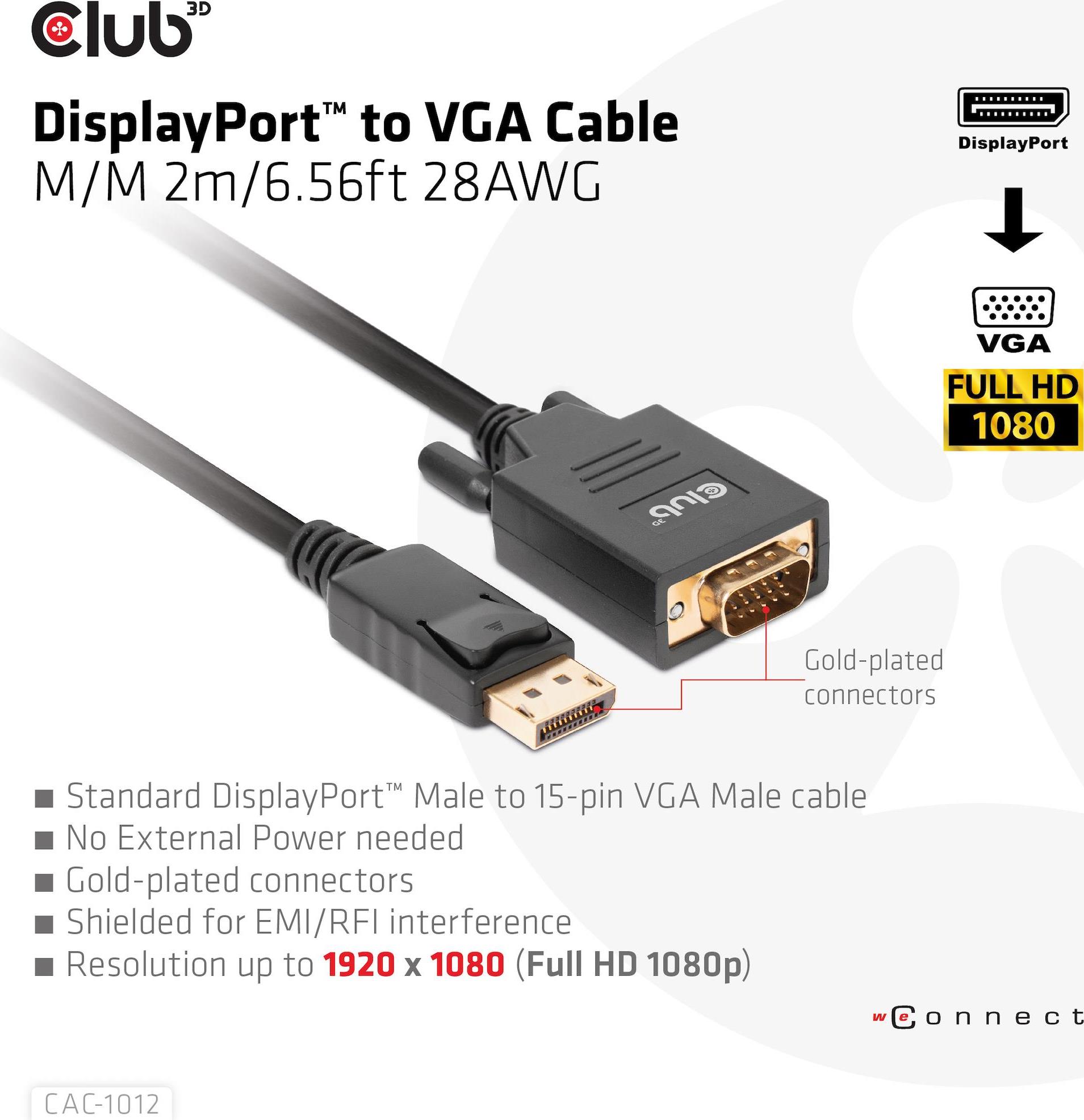 Das Club 3D CAC-1012 DisplayPort auf VGA-Kabel St./St. 2 m 28 AWG verbindet jeden mit DisplayPort ausgestatteten Desktop, Laptop oder Adapter mit einem Monitor, Display, Beamer oder Projektor mit einer 15-poligen VGA-Buchse. Ideal für zu Hause oder bei der Arbeit, stellt das Kabel eine zuverlässige Verbindung für alles vom Gaming bis zur Videoprojektion her und unterstützt Full HD 1080p (max. Auflösung von 1920 x 1080). Ein Micro-USB-Port ist auch für die externe Stromversorgung vorgesehen. Dieses hochwertige DisplayPort auf VGA-Kabel bietet dank der kombinierten Wirkung seiner vergoldeten Stecker und der 28 AWG-Verbindung eine überragende Leistung. Die interne Abschirmung reduziert übersprechen, unterdrückt Rauschen und hilft, elektromagnetische Störungen (EMI) und Hochfrequenzstörungen (RFI) zu verhindern. Erleben Sie eine zuverlässige, qualitativ hochwertige Verbindung mit diesem praktischen 2 m langen DisplayPort auf VGA-Kabel.