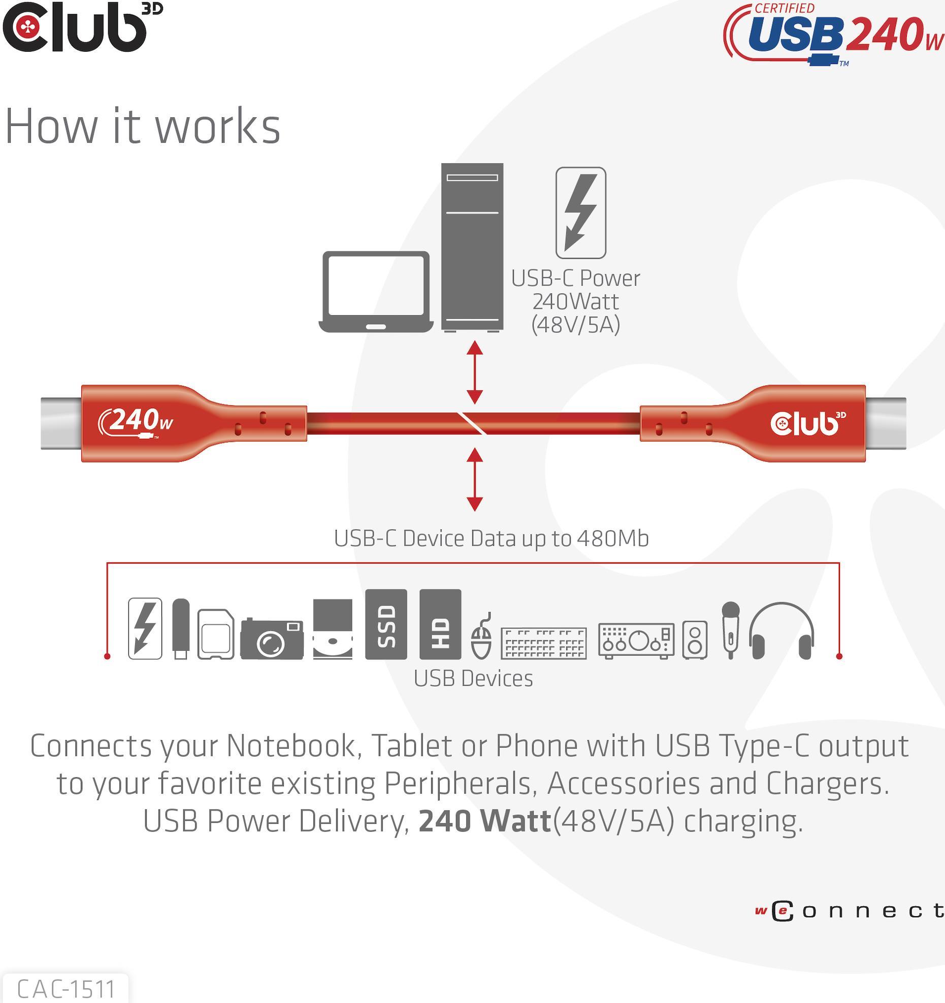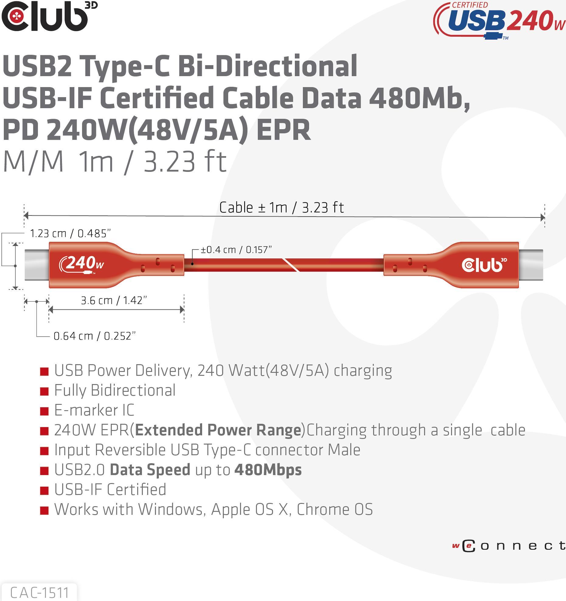 Das Club 3D CAC-1511 USB 2.0 Typ-C bidirektionales USB-IF zertifiziertes Kabel, Daten 480 Mb, PD 240 W (48 V/5 A) EPR, Extended Power Range M/M 1 m / 3.23 ft verbindet Ihr Notebook, Tablet oder Telefon mit USB Typ-C Ausgang mit Ihren bevorzugten vorhandenen Peripheriegeräten, Zubehör und Ladegeräten. Es ermöglicht Daten und Strom über ein einziges Kabel und in beide Richtungen. Dieses Kabel unterstützt USB 2.0 Daten 480 Mbps und 240 Watt (48 V/5 A) Ausgang für Downstream-Laden oder Stromversorgung Ihres Notebooks, Tablets oder Smartphones.