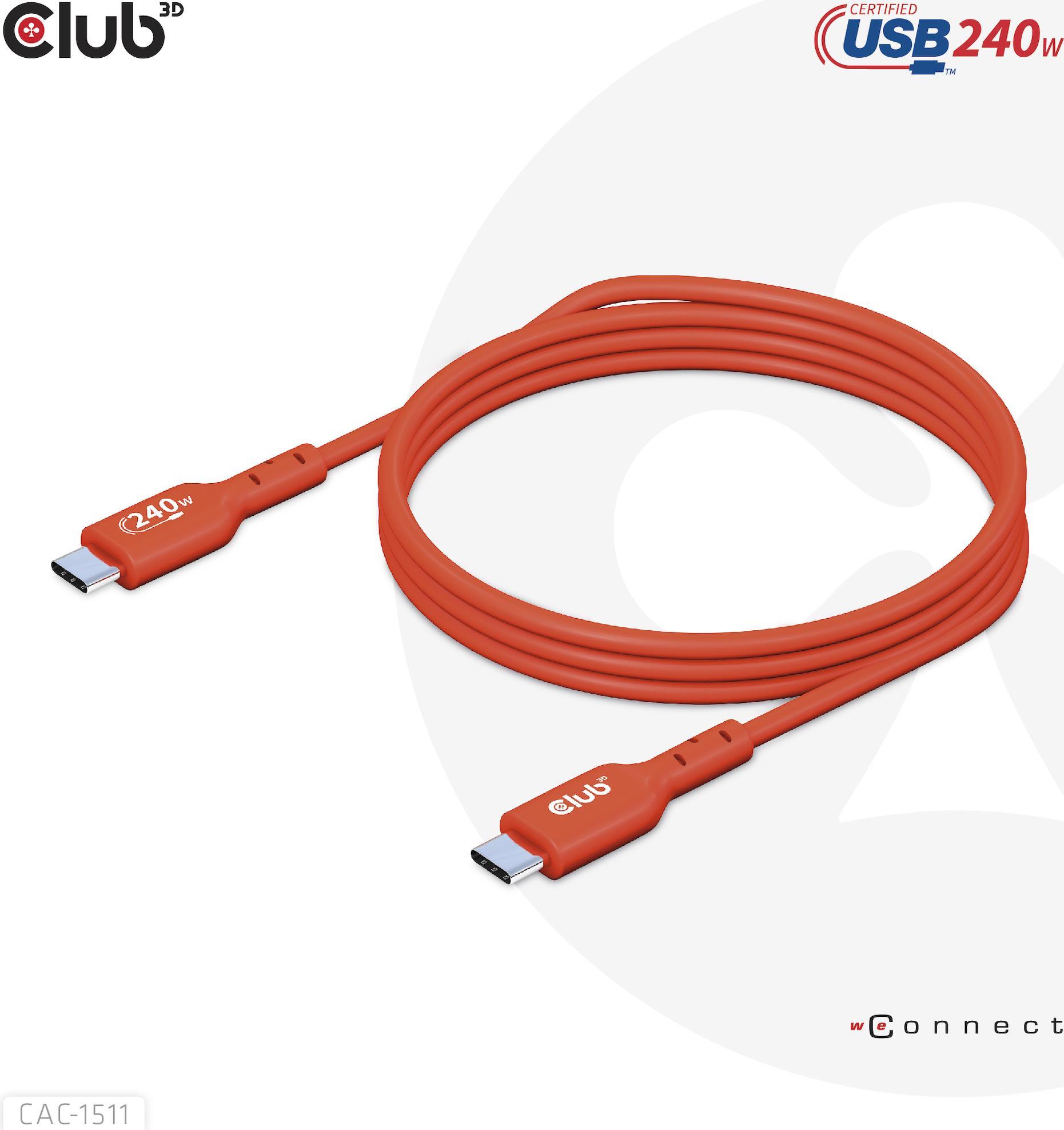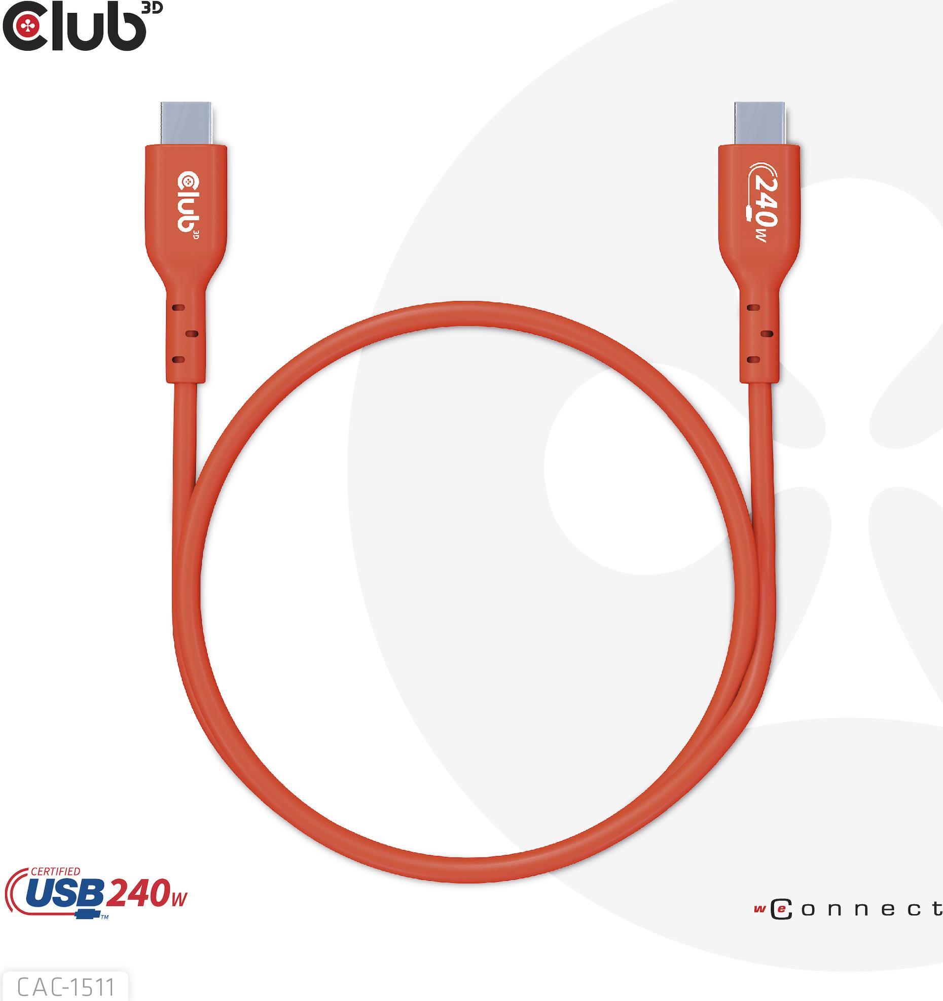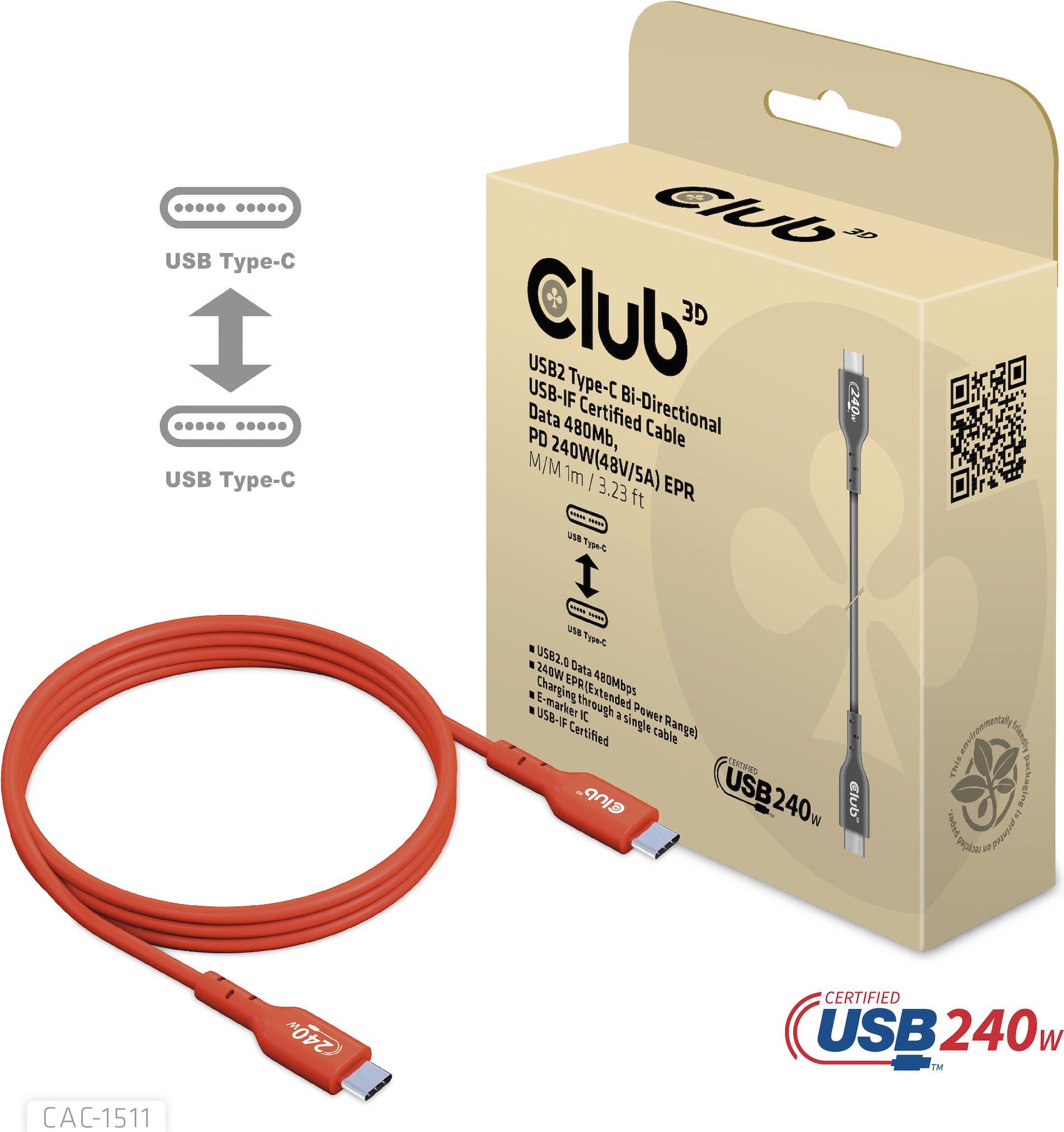 Club 3D - USB-Kabel - 24 pin USB-C (M) zu 24 pin USB-C (M) - USB 2.0 - 48 V - 5 A - 1 m - bi-direktional, unterstützt bis zu 240 W Spannungsversorgung, Baureihe mit erweitertem Leistungsbereich (EPR