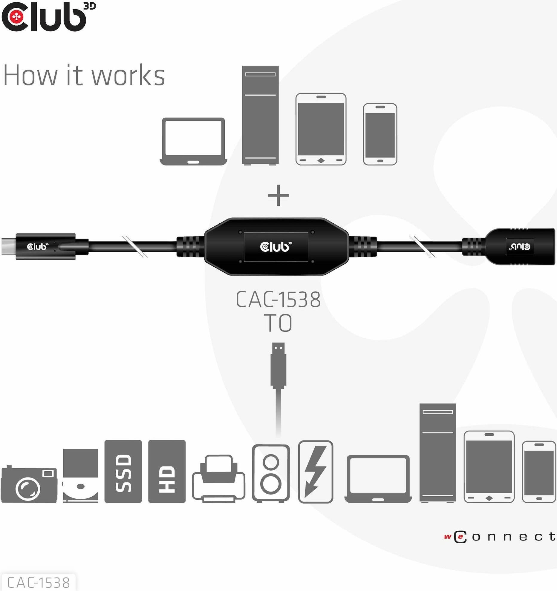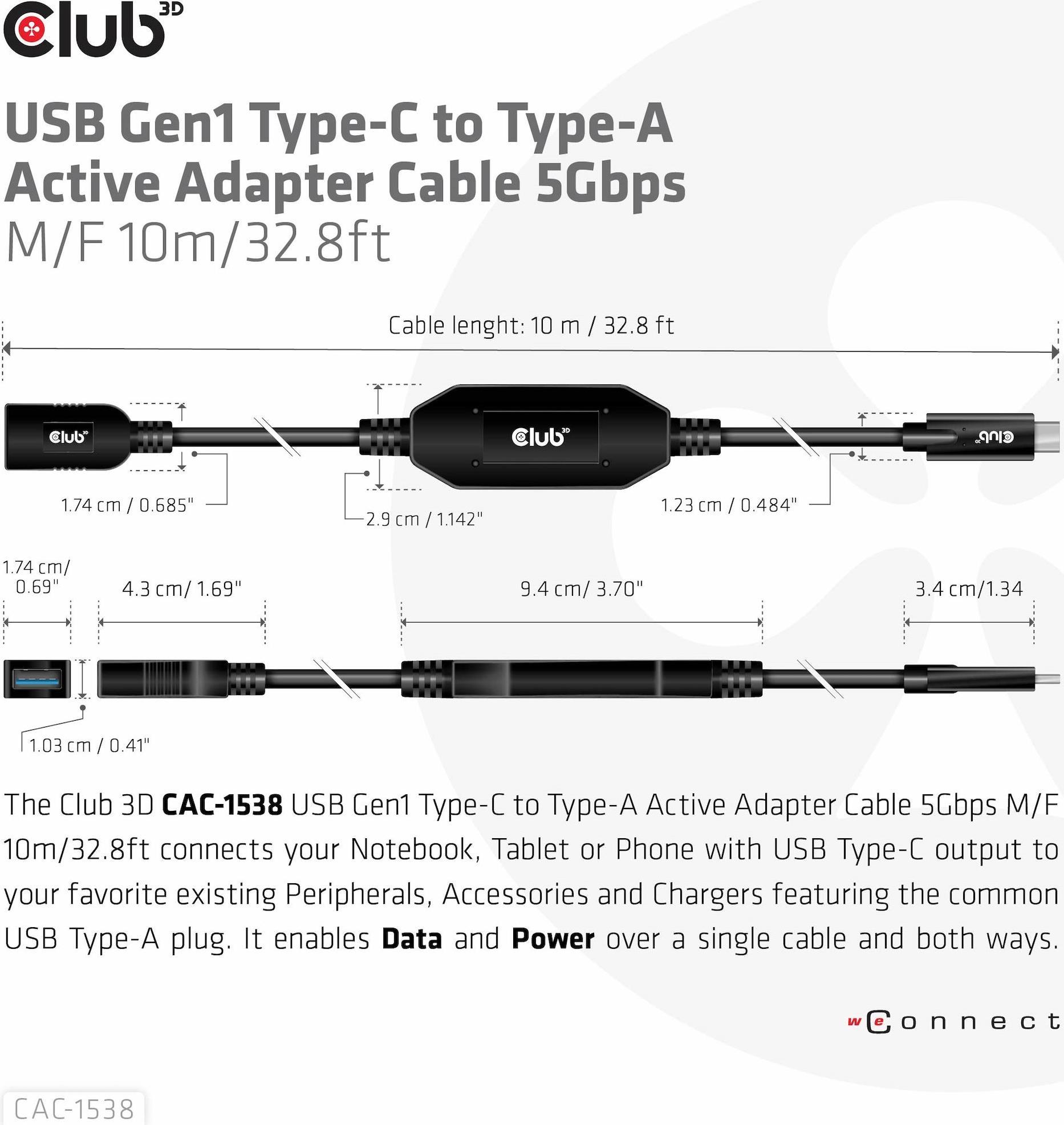 Das Club 3D CAC-1538 USB Gen 1 Type-C auf Typ-A aktives Adapter-Kabel 5 Gbps Stecker/Buchse verbindet Ihr Notebook, Tablet oder Smartphone mit USB-Type-C Ausgang mit Ihren wichtigsten Peripherieprodukten, Zubehör und Ladegeräten, die mit dem gebräuchlichen USB-Typ-A Port ausgestattet sind. Es ermöglicht Datentransfer und Strom über ein einziges Kabel und in beide Richtungen. Dieses Kabel unterstützt USB Gen 1 SuperSpeed+ Datentransfer bis zu 5 Gbps und bis zu 900 mA Ausgabe für Downstream-Laden oder Stromversorgung für Ihr mit USB-Typ-A ausgestattetes Notebook, Tablet oder Smartphone.
