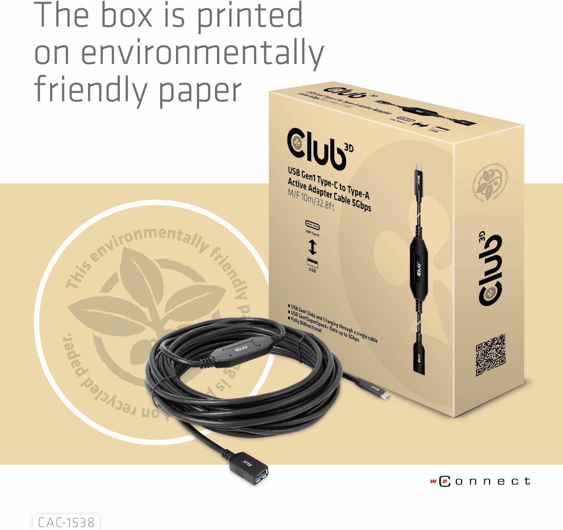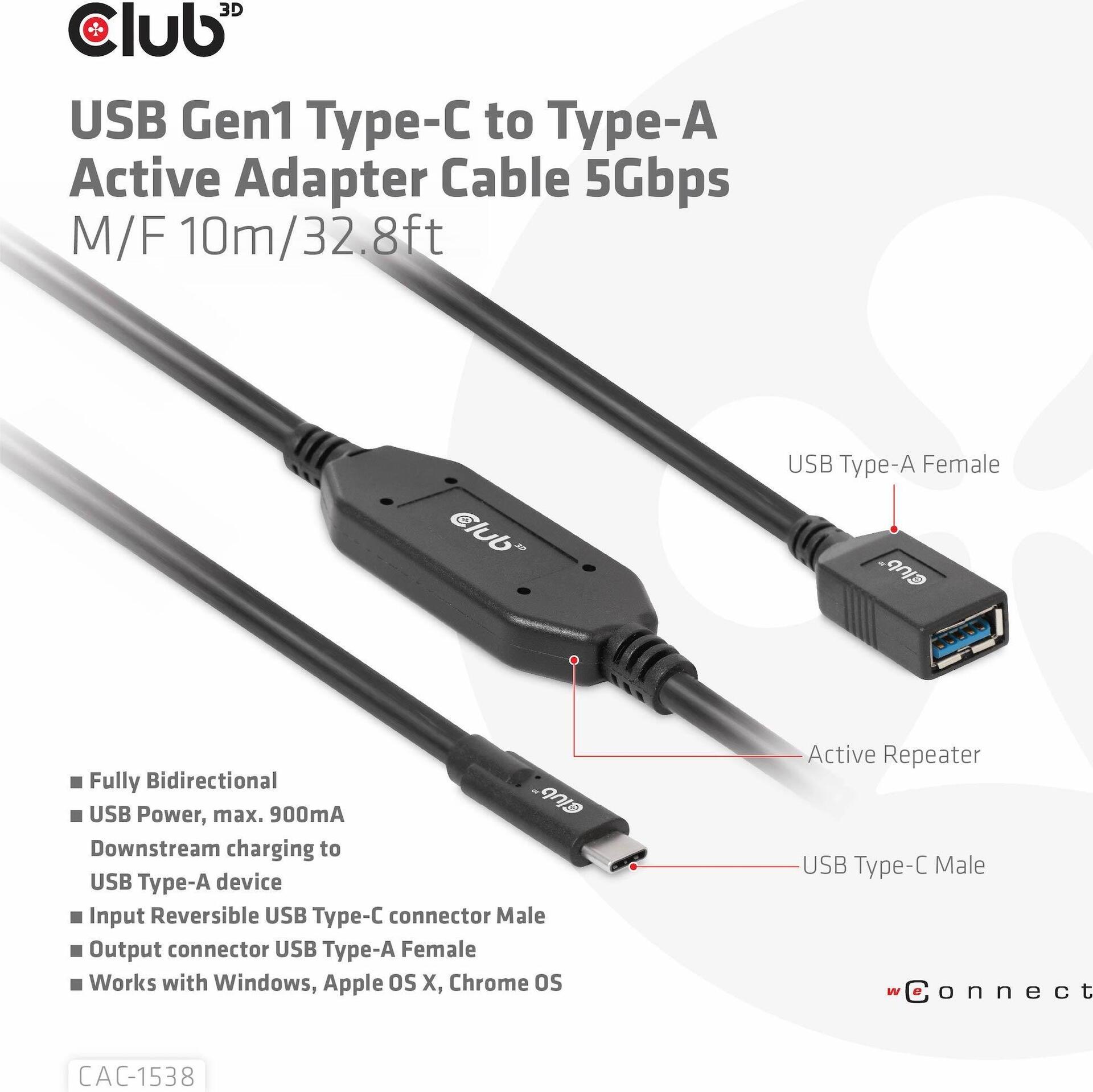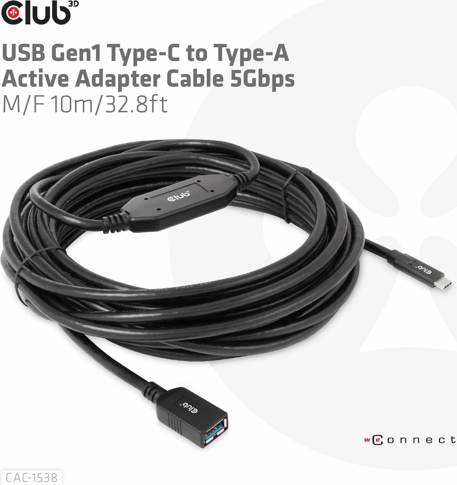 Club 3D - USB-Kabel - USB-C (M) bis USB Typ A (W) - USB 3.1 Gen 1 - 0.9 A - 10 m - aktiv