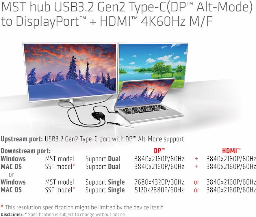 Schließen Sie mehrere Displays an Ihr Ultrabook an. Ultrabooks und Notebooks werden immer leistungsfähiger und dabei gleichzeitig schlanker in der Bauweise. Mit einem einzigen verfügbaren USB 3.2 Gen 2 Port können Sie nun gleichzeitig einen DisplayPort Bildschirm und ein HDMI 2.0 Display mit 4K@60Hz oder ein DP Display mit 8K@30Hz im MST Modus (Windows) betreiben. Alles was Sie dafür benötigen ist ein freier USB 3.2 Gen 2 Port mit DP Alt-Mode auf Ihrem Smartphone, Laptop oder Ultrabook, um den MST Hub anzuschließen. Sie erhalten bisher noch nicht mögliche Verbindungsoptionen für Dual 4K@60Hz Displays. Wenn Ihr System diese Funktion unterstützt, ist das Setup einfach und schnell erledigt.