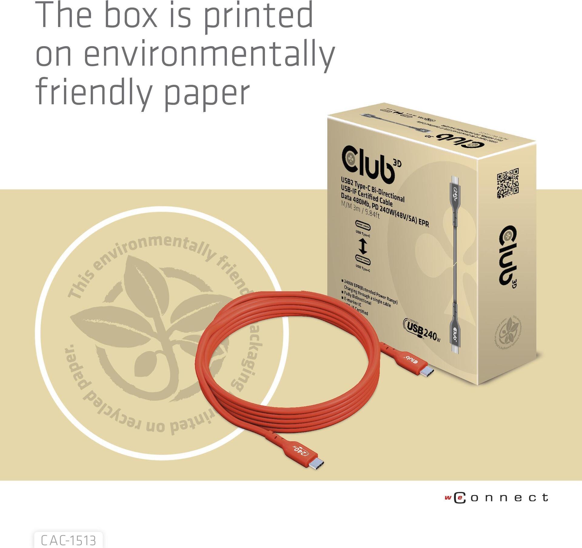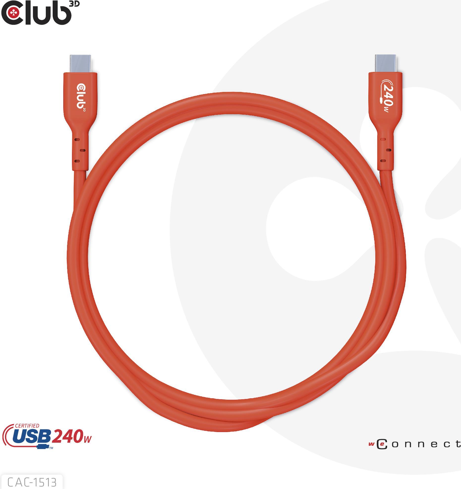 Club 3D - USB-Kabel - 24 pin USB-C (M) zu 24 pin USB-C (M) 5 A - 3,0m - bi-direktional, unterstützt bis zu 240 W Spannungsversorgung, Baureihe mit erweitertem Leistungsbereich (EPR (CAC-1513)