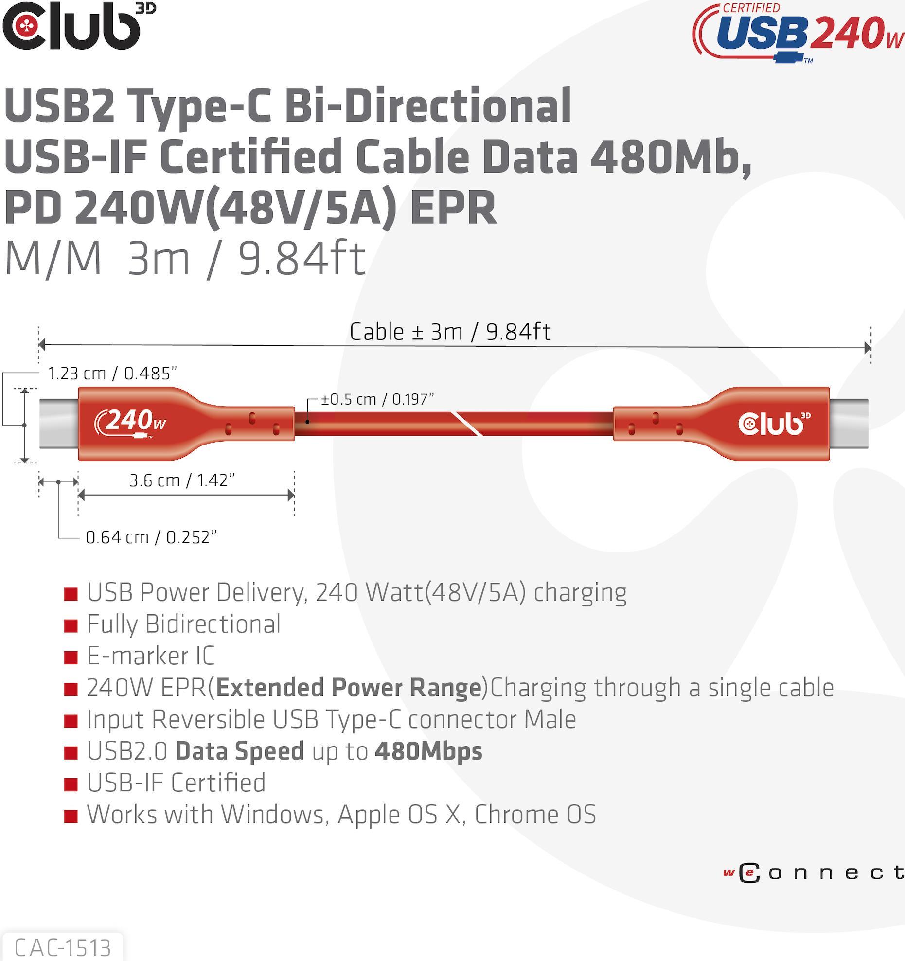 Das Club 3D CAC-1513 USB2.0 Typ-C Bi-Directional USB-IF Certified Cable, Data 480Mb, PD 240W(48V/5A) EPR, Extended Power Range M/M 3m / 9.84 ft verbindet Ihr Notebook, Tablet oder Telefon mit USB Typ-C Ausgang mit Ihren bevorzugten vorhandenen Peripheriegeräten, Zubehör und Ladegeräten. Es ermöglicht Daten und Strom über ein einziges Kabel und in beide Richtungen. Dieses Kabel unterstützt USB2.0-Daten bis zu 480Mbps und bis zu 240Watt (48V/5A) Ausgang für Downstream-Laden oder Stromversorgung Ihres Notebooks, Tablets oder Smartphones.