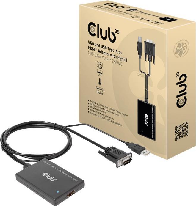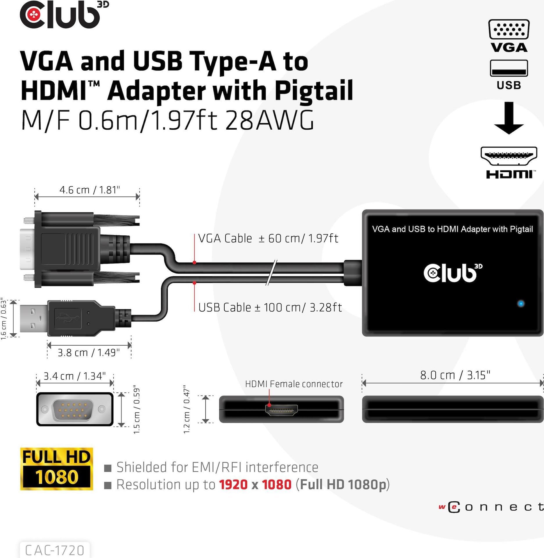 Der Club 3D CAC-1720 VGA- und USB-Typ-A-auf-HDMI-Adapter mit Pigtail St./B 0,6 m 28AWG verbindet jeden mit VGA ausgestatteten Desktop, Laptop oder Adapter mit einem Monitor, Display, Beamer oder Projektor mit HDMI -Stecker. Ideal für zu Hause oder bei der Arbeit, stellt der Adapter eine zuverlässige Verbindung für alles vom Gaming bis zur Videoprojektion her und unterstützt bis zu Full HD 1080p (max. Auflösung von 1920 x 1080). Ein USB-Typ-A-Port ist auch für die externe Stromversorgung vorgesehen. Dieses hochwertige VGA-zu-HDMI-Kabel bietet dank der kombinierten Wirkung seiner vergoldeten Anschlüsse und 28 AWG-Verbindung eine überragende Leistung. Die interne Abschirmung sorgt für reduziertes Übersprechen, unterdrückt Rauschen und hilft, elektromagnetische Störungen (EMI) und Hochfrequenzstörungen (RFI) zu vermeiden.