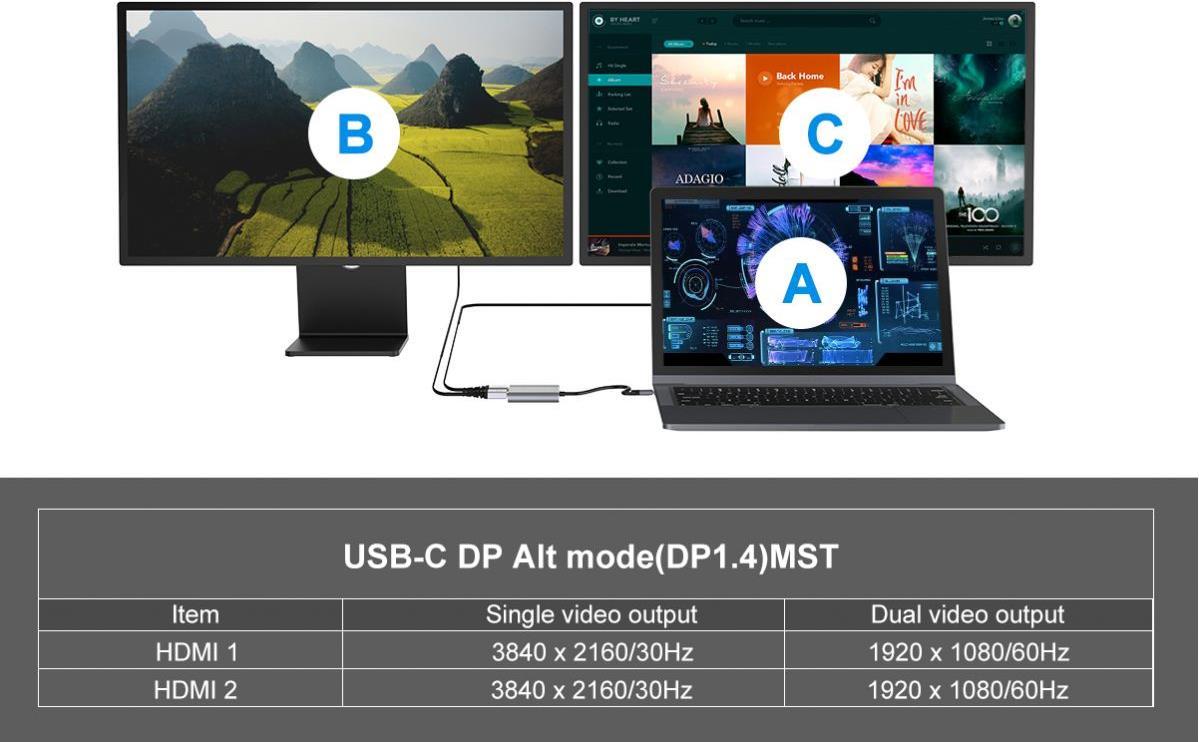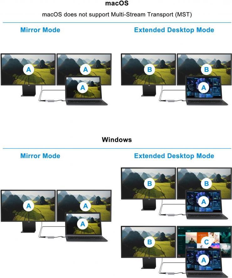 | Leistungsmerkmale | Unterstützung für Dualanzeige, MST (Multi-Stream Transport), 100 W-Spannungsversorgung, Mirror Mode, Extended Mode, Aluminiumgehäuse |