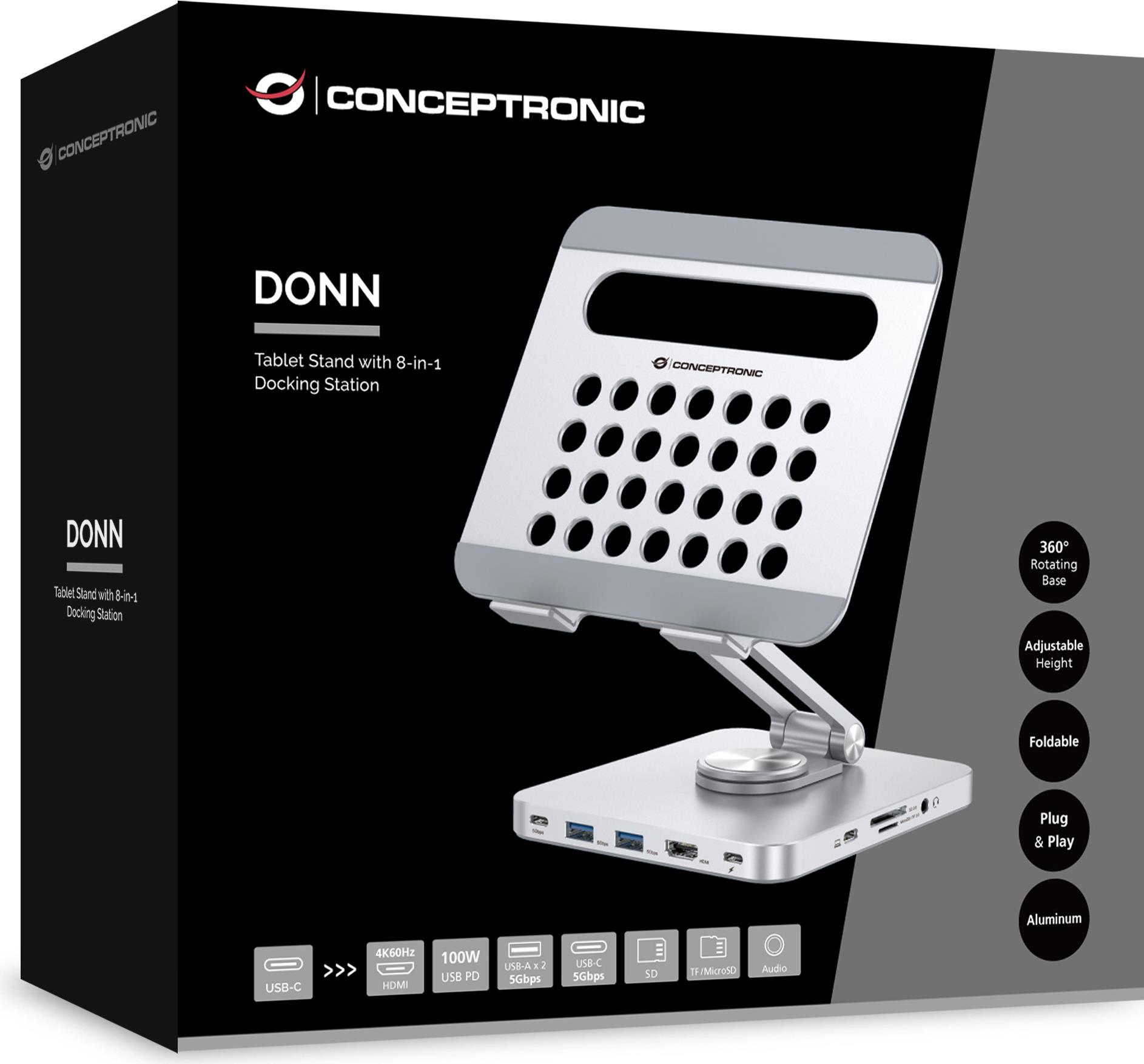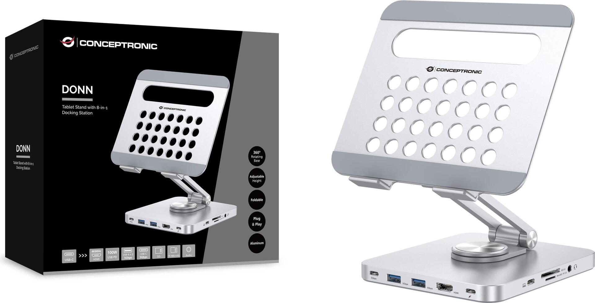 Conceptronic DONN26G Tablet-Ständer mit 8-in-1-Dockingstation - 360° drehbare Basis - faltbar - höhenverstellbar (DONN26G)
