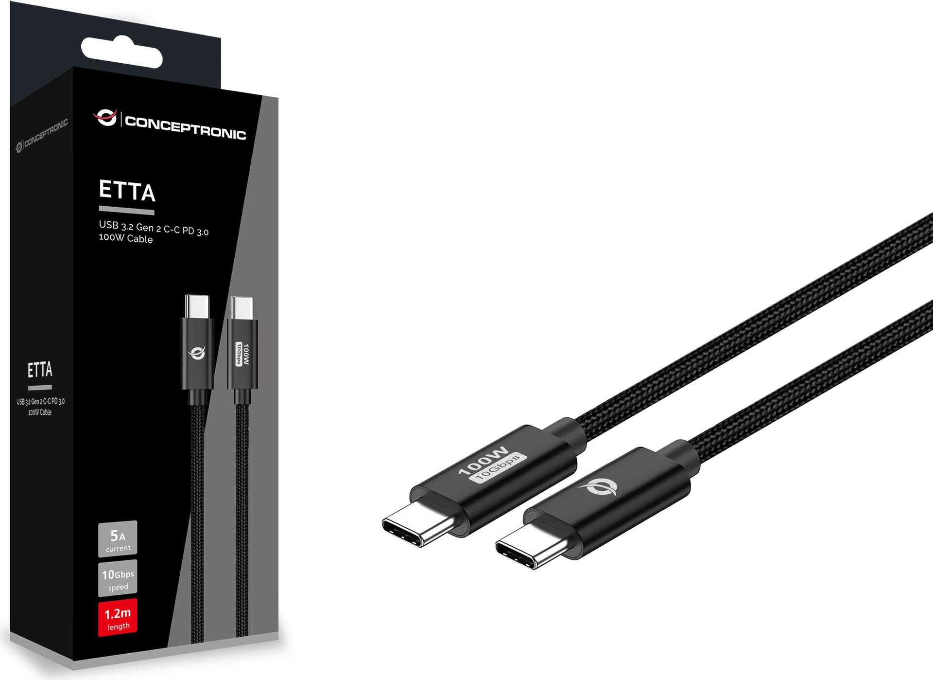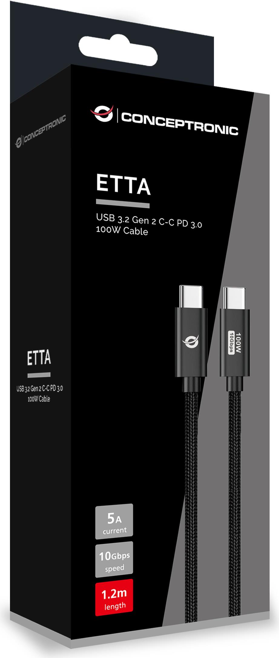 Conceptronic ETTA02B12 USB 3.2 Gen 2 C-C PD 3.0 100W Kabel - 1,2m - 20V 5A - 10Gbps - E-Mark (ETTA02B12)