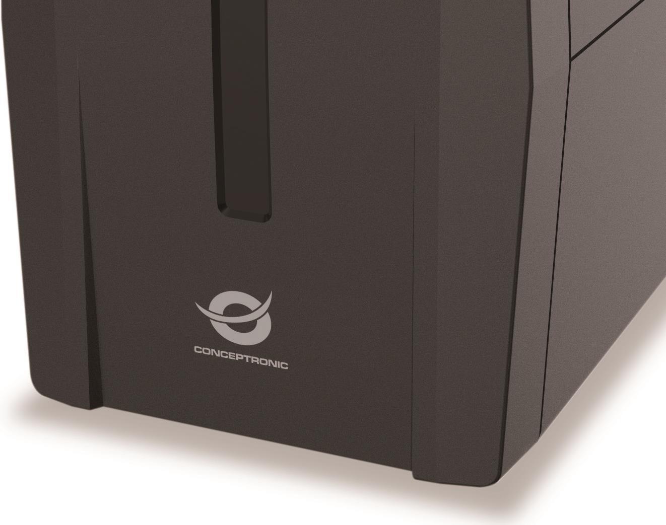 Die Conceptronic USV bietet lang anhaltende, zuverlässige Notstromversorgung für Klein- und Heimbüros. Das Gerät zeichnet sich durch eine unkomplizierte Installation und Bedienung aus, bietet eine einfache und sichere Methode zum Schutz Ihrer Systeme vor gefährlichen Überspannungen und Stromausfällen. Die UPS ist mit Modem/LAN-Schutz, einem leistungsstarken Mikroprozessor und einer Fehleranzeige ausgestattet, die vor gefährlicher Verkabelung warnt. Dank des eleganten, kompakten Designs eignet sich die UPS ideal für den beschränkten Arbeitsplatz in Klein- und Heimbüros.Produkttext[/head]Die Conceptronic USV bietet langanhaltende, zuverlässige Notstromversorgung für Klein- und Heimbüros. Das Gerät zeichnet sich durch eine unkomplizierte Installation und Bedienung aus, bietet eine einfache und sichere Methode zum Schutz Ihrer Systeme vor gefährlichen Überspannungen und Stromausfällen. Die UPS ist mit Modem/LAN-Schutz, einem leistungsstarken Mikroprozessor und einer Fehleranzeige ausgestattet, die vor gefährlicher Verkabelung warnt. Dank des eleganten, kompakten Designs eignet sich die UPS ideal für den beschränkten Arbeitsplatz in Klein- und Heimbüros.Integrierter automatischer Spannungsregler schützt vor SpannungsschwankungenLeistungsstarker MikroprozessorAC/Automatischer NeustartGleichspannungsstartModem/LAN-SchutzEin USB-Port[head]Hauptmerkmale