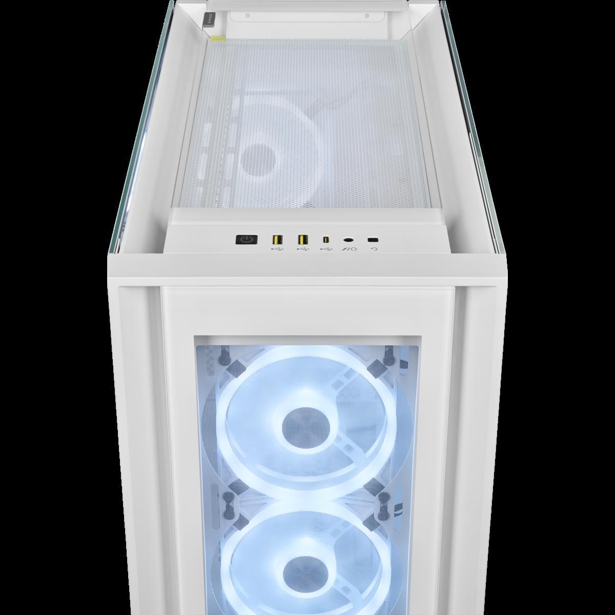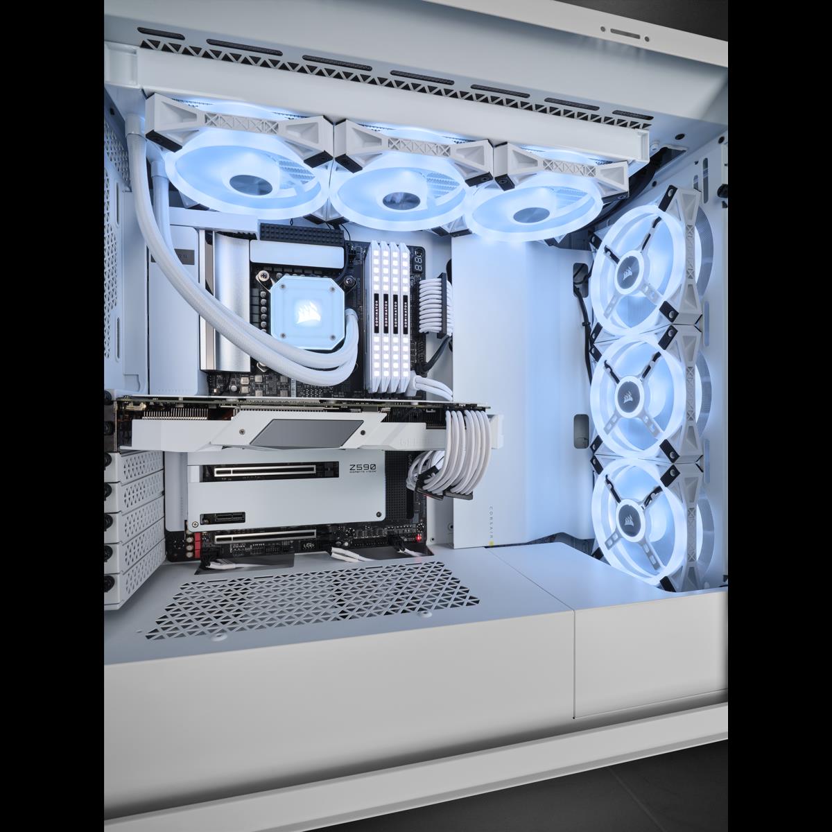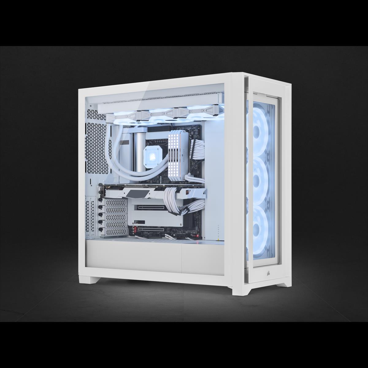 Das CORSAIR iCUE 5000X RGB QL-Edition Mid-Tower-Gehäuse ist ein komplett weißes 5000X RGB-Gehäuse und enthält vier vorinstallierte QL120 RGB-Lüfter sowie einen iCUE Lighting Node CORE.