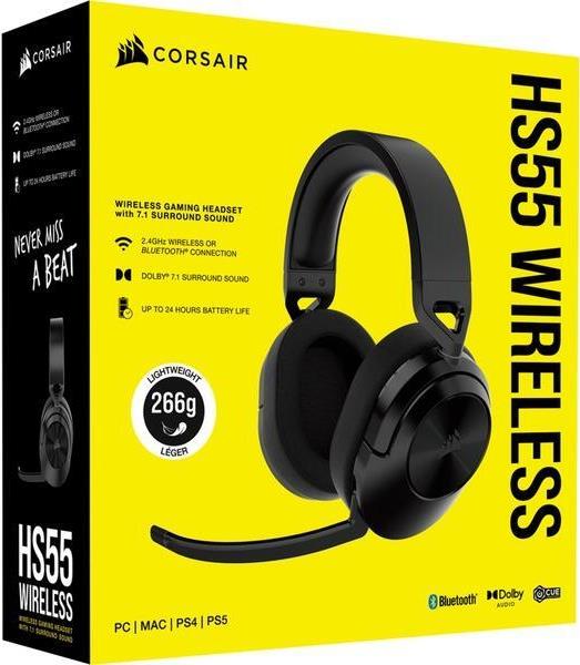 Das CORSAIR HS55 Wireless Core Gaming Headset verbindet kabellose 2,4-GHz-Audio- oder Bluetooth-Verbindungen mit geringer Latenz und einer leichten Konstruktion, die den ganzen Tag über kabellosen Komfort und großartigen Klang bietet.