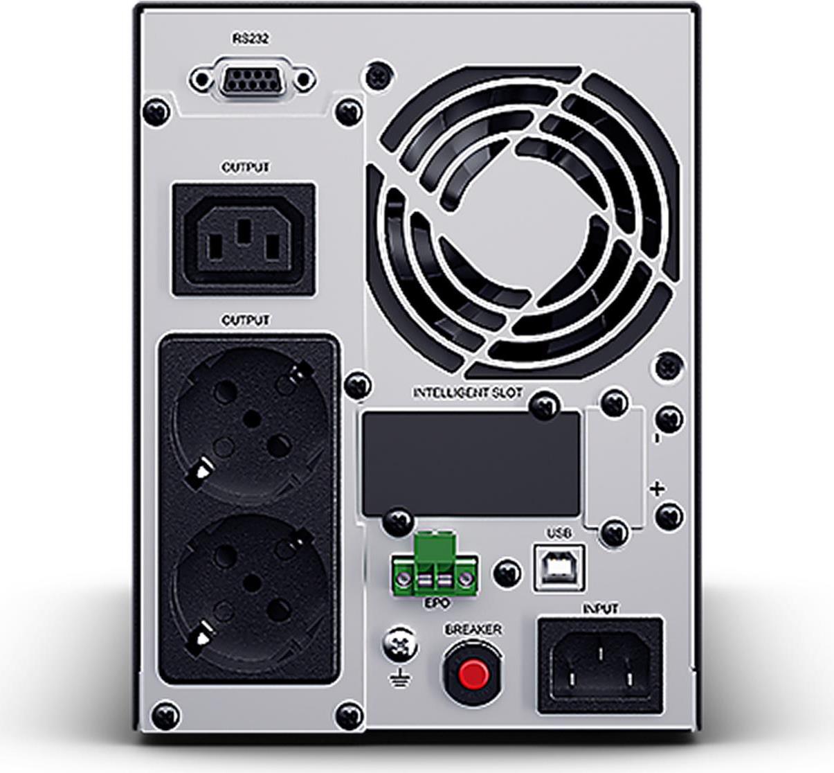 | Besonderheiten | Lüfter mit variabler Geschwindigkeit, Metallgehäuse, hörbarer Alarm, Not-Aus, LCD Anzeige, interner Bypass, Überlastungsschutz, Smart Battery Management (SMB), Eco-Mode, Starterbatterie, generatorkompatibel, Doppelwandlerprinzip, ohne Umschaltzeit |