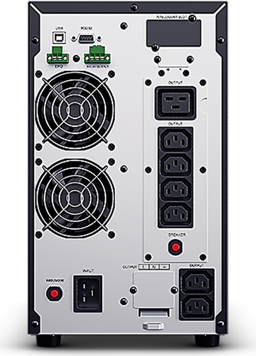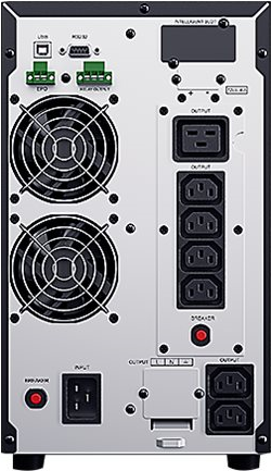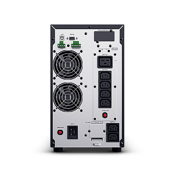 | Besonderheiten | 2 integrierte Lüfter, Lüfter mit variabler Geschwindigkeit, Metallgehäuse, hörbarer Alarm, Not-Aus, LCD Anzeige, interner Bypass, Überlastungsschutz, Smart Battery Management (SMB), Eco-Mode, Starterbatterie, generatorkompatibel, Doppelwandlerprinzip, ohne Umschaltzeit |