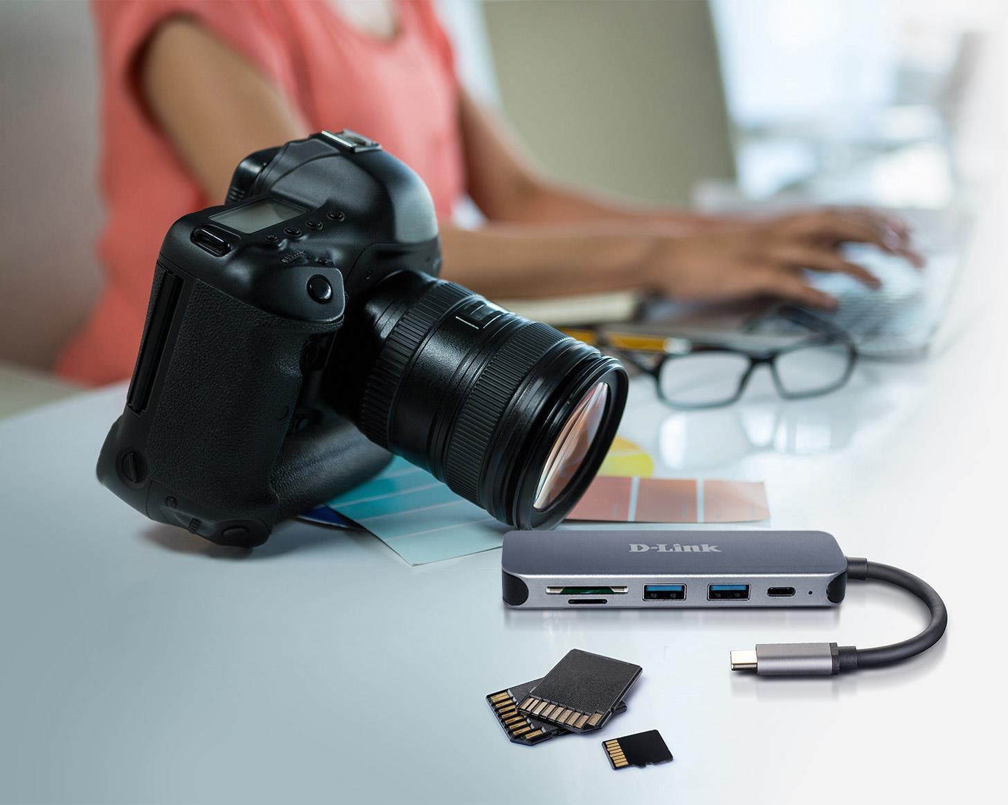 Der DUB-2325 5-in-1-USB-C-Hub mit Kartenleser fügt Ihren Windows- und macOS-Computern, Chromebooks und dem iPad Pro sofort einen SD-Kartenleser, zwei USB 3.0-Anschlüsse und einen USB-C-Anschluss hinzu. Sie können bis zu zwei USB-Geräte anschließen und eine microSD- oder reguläre SD-Karte einlegen, sodass Sie direkten Zugriff auf Ihre Fotos in voller Auflösung haben, die auf Speicherkarten von Ihren Kameras gespeichert sind. Sie können auch ein USB-C-Gerät synchronisieren, was bedeutet, dass Sie nicht auf den USB-C-Anschluss verzichten müssen, an den dieser Hub angeschlossen ist.