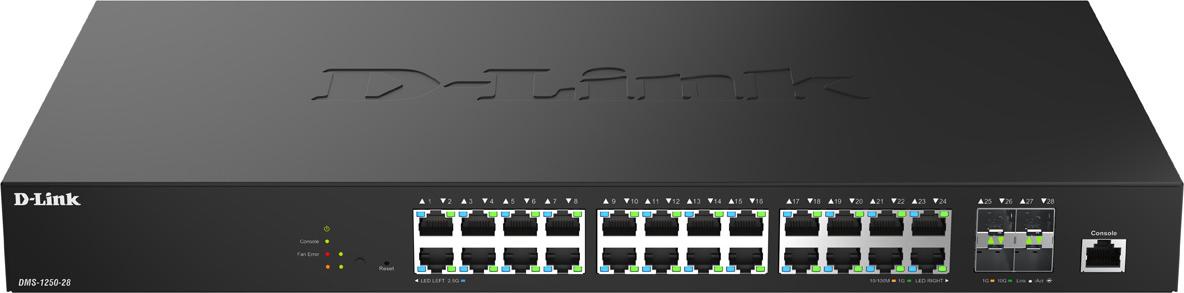 Der D-Link DMS 1250-28 ist eine Switching-Lösung, die auf Leistung und Skalierbarkeit ausgelegt ist und sich daher für wachsende Netzwerke eignet. Mit einer Switching-Kapazität von 200 Gbit/s und einer Paketweiterleitungsrate von 148,81 Mpps bewältigt dieser Switch den Datenverkehr und sorgt für einen reibungslosen Betrieb Ihres Netzwerks. Seine 28 Ports umfassen 24 Anschlüsse für 10/100/1000/2,5G-Verbindungen und 4 10-Gigabit-SFP+-Ports und bieten vielseitige Anschlussmöglichkeiten für verschiedene Geräte.